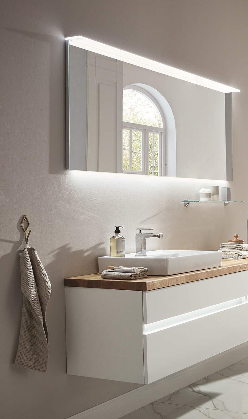 Darunter befindet sich der Waschtischunterschrank mit zwei großen Auszügen. So haben Sie genügend Stauraum für alle wichtigen Utensilien in Ihrem Badezimmer. Ergänzt werden kann dieser durch eine passende Griffbeleuchtung inklusive Bewegungssensor, die für ein besonderes Ambiente sorgt.