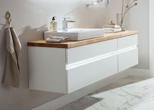 Ein absolutes Highlight ist die qualitativ hochwertige Massivholz-Waschtischplatte aus Eiche, die mit einem passenden Waschtischausschnitt ausgestattet ist.