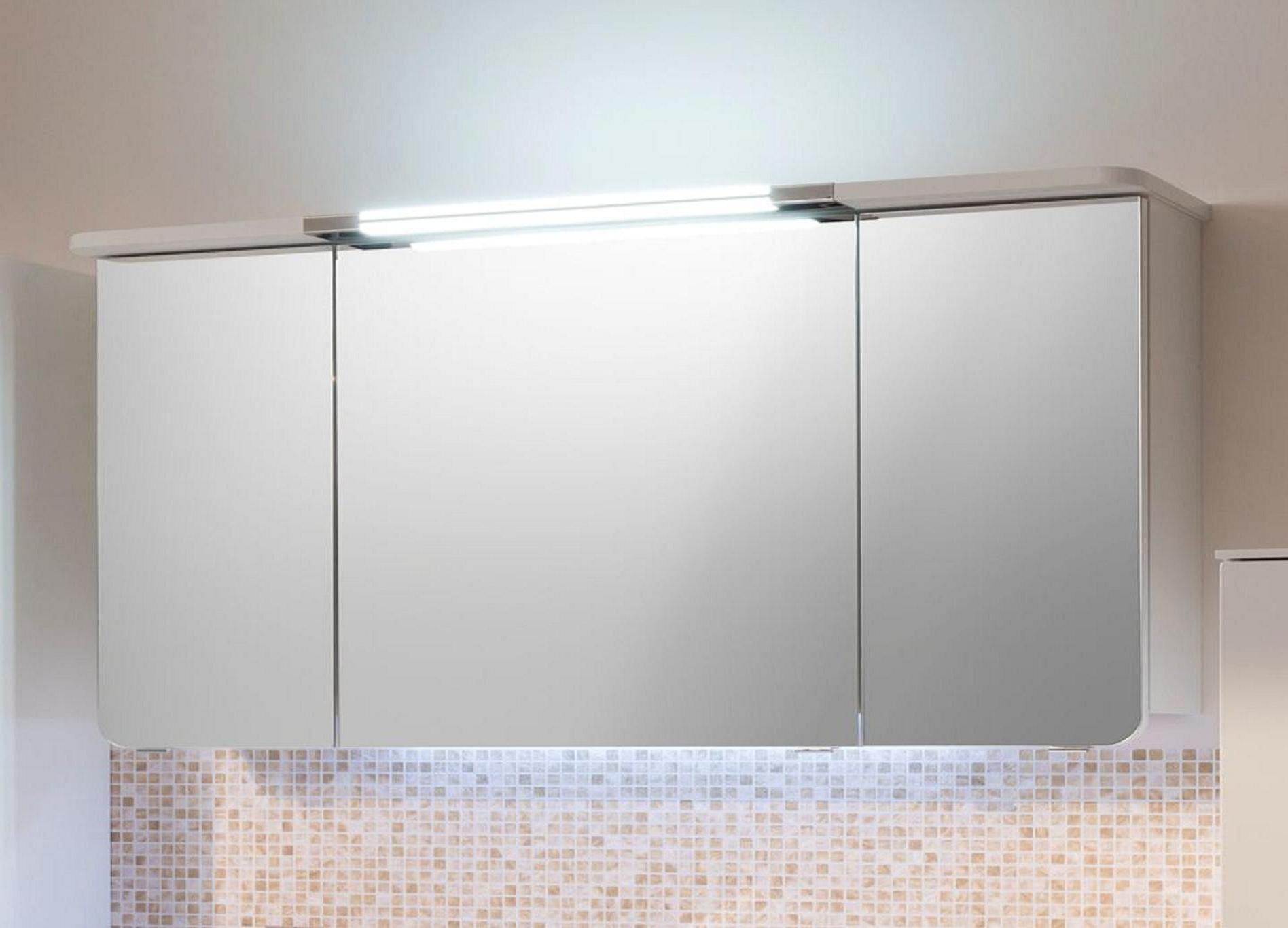 Der dreitürige, geradliniger Spiegelschrank mit integrierten Beleuchtung im Kranzboden sticht sofort ins Auge und ist das Highlight in Ihrem Badezimmer.