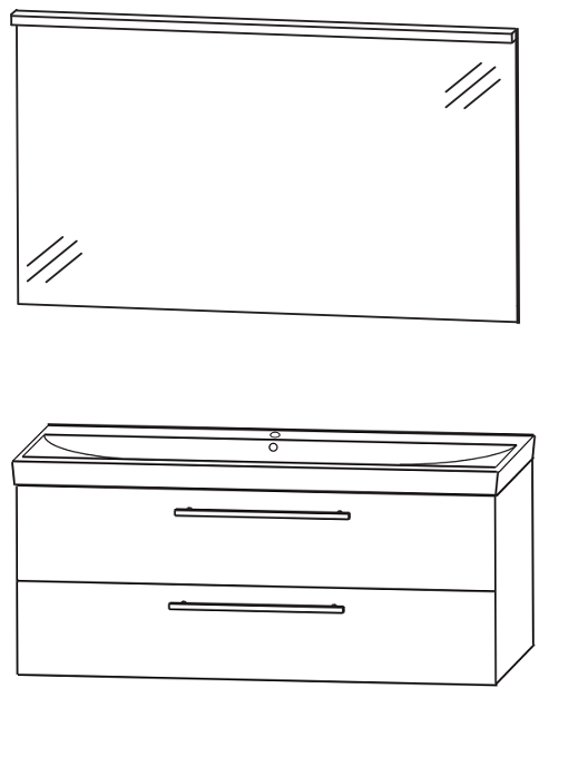 Ein 100 cm breites Badmöbelset mit Keramik Möbelwaschtisch, Waschtischunterschrank und einem Flächenspiegel mit einer waagerechten LED-Beleuchtung inklusive Kippschalter.