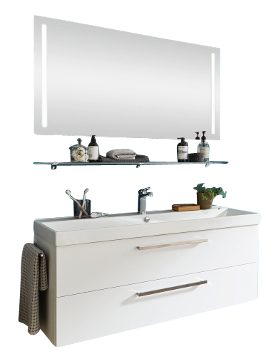 Ein 120 cm breites Badmöbelset mit Keramik Möbelwaschtisch, Waschtischunterschrank und einem Flächenspiegel mit seitlichen LED-Streifen.