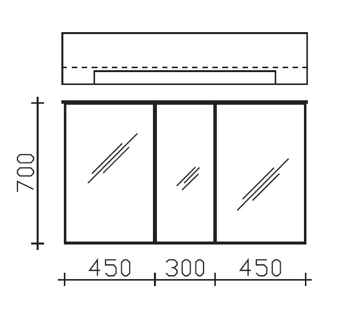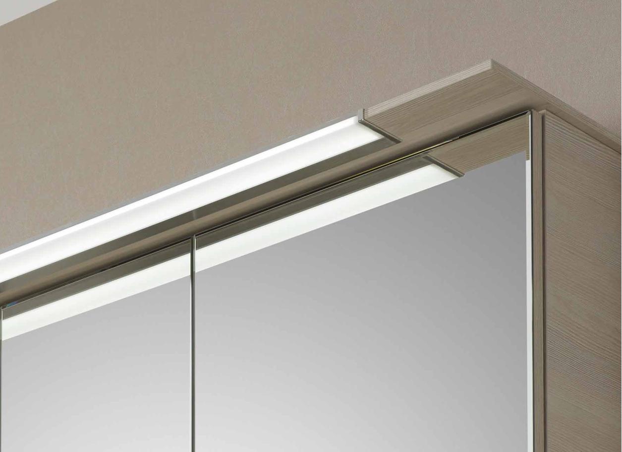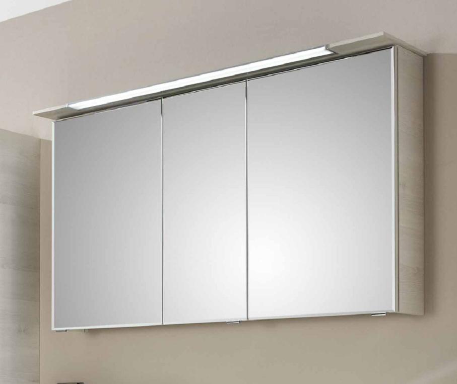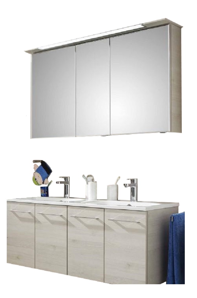Bei diesem Badmöbelset ist bereits im Lieferumfang ein praktischer Spiegelschrank mit einer Breite von 120 cm enthalten. Der geradlinige Badezimmerspiegelschrank besteht aus drei Spiegeltüren. Die beiden Äußeren etwas breiter mit 45 cm und die Mittlere etwas schmäler mit 30 cm. Unterteilt wird der Innenraum des Spiegelschrankes noch mit sechs Glaseinlegeböden, welche für eine bestmögliche Ausnutzung und Platzschaffung des Spiegelschrankes sorgen. Im obigen Kranzboden eingearbeitet finden Sie eine tolle 10W-LED-Beleuchtung. Diese ist mittig oberhalb der Spiegelflächen angebracht und sorgt für eine optimale Ausleuchtung Ihres Badezimmerspiegels.