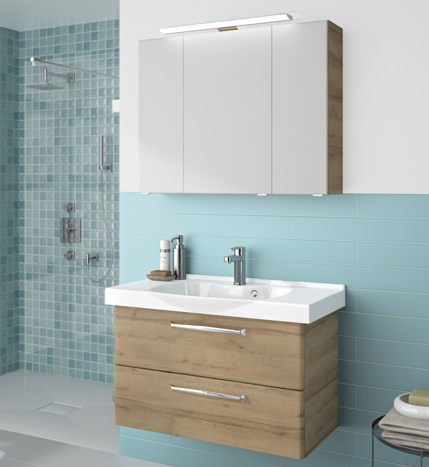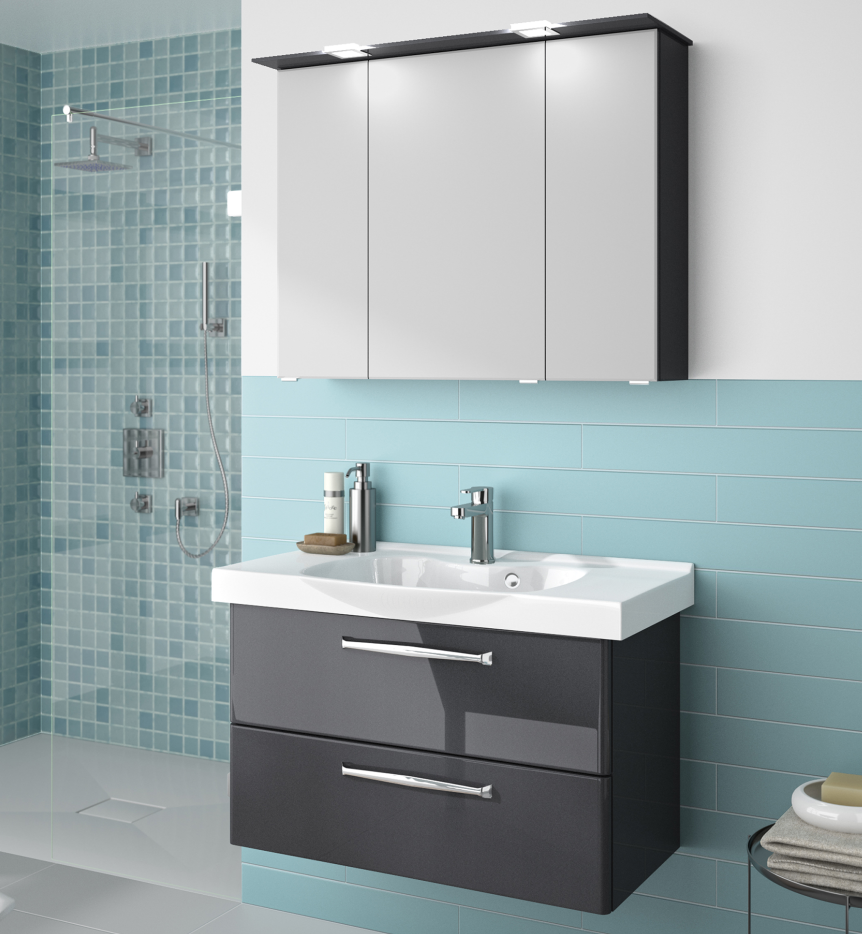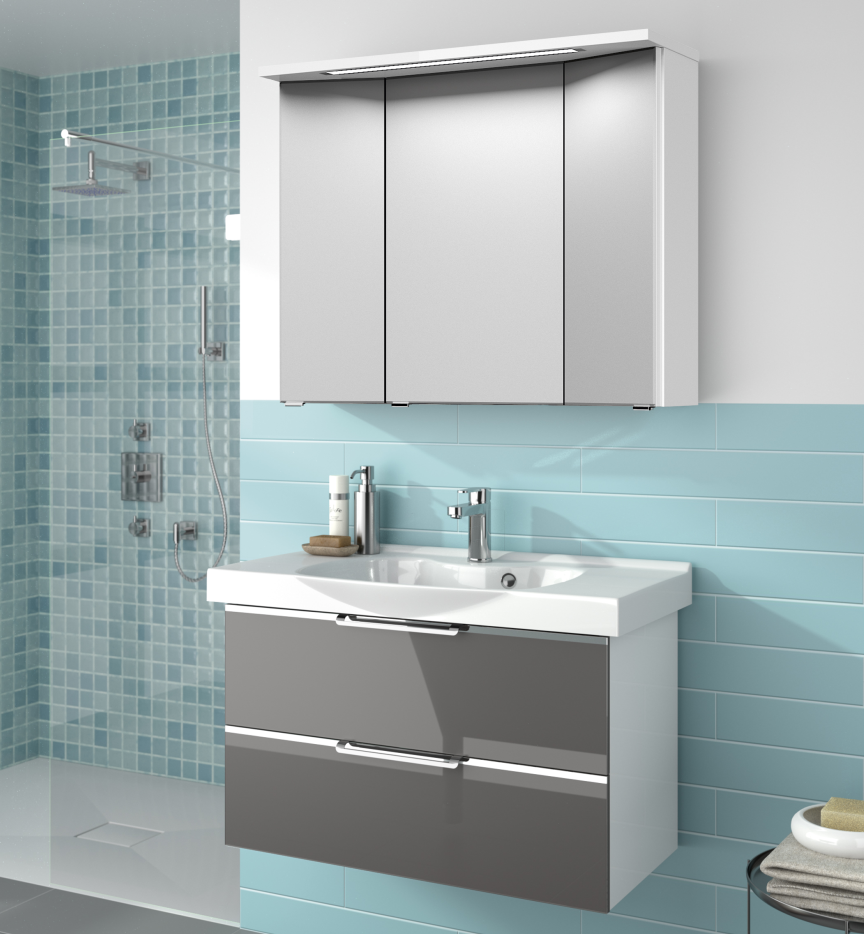 Abgerundet wird das Pelipal TrenTino Badmöbelset mit einem dreitürigen Spiegelschrank in der Breite 90 cm. Alle Spiegelschrankvarianten sind mit drei einfach verspiegelten Spiegeltüren, sechs Glaseinlegeböden und einem Schalter-Steckdosen-Modul ausgestattet. Unterschieden wird hier zwischen verschiedensten Leuchtmittel-, bzw. Leuchtvarianten. Wunderschöne, im Kranzboden eingearbeitete Halogen- oder LED-Beleuchtungen, LED-Strahler oder eine moderne Aufsatzleuchte.