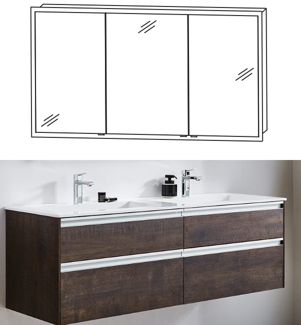 Ein 142 cm breites Badmöbelset inkl. Doppelwaschtisch und einem Unterschrank inklusive vier Auszügen sowie einem Einbauspiegelschrank