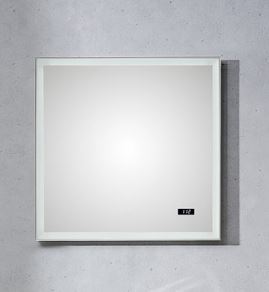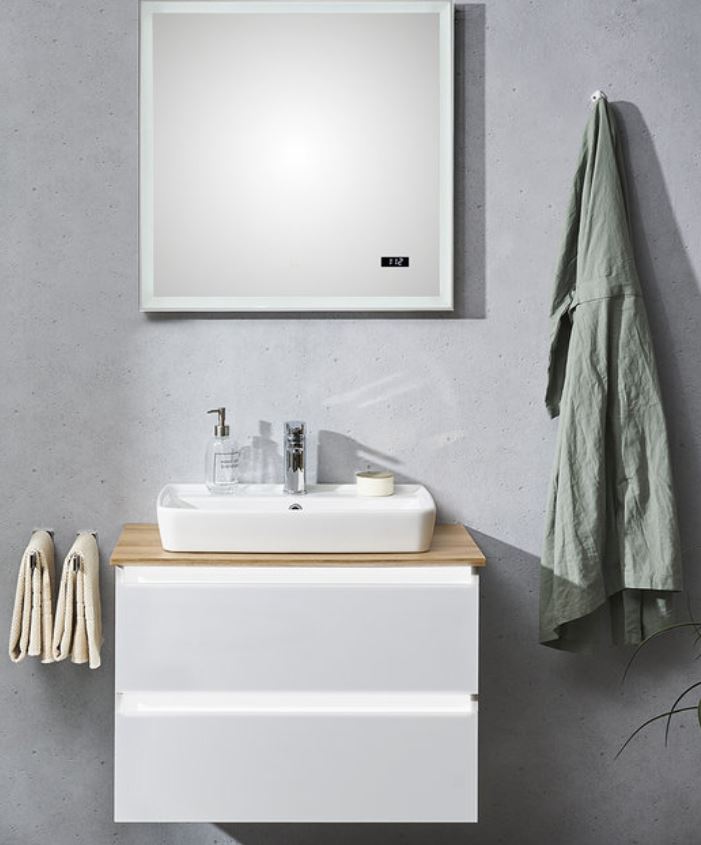 Abgerundet wird das Waschtischset durch den beleuchteten Badspiegel in einer Breite von 70 cm. Der moderne Flächenspiegel ist mit einer Uhranzeige und einer umlaufenden LED-Beleuchtung ausgestattet.