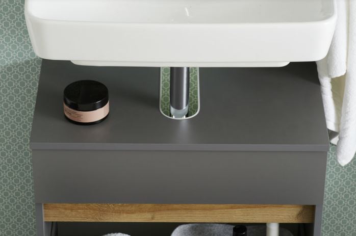 Der Waschtischunterschrank ist mit zwei Drehtüren und Siphonausschnitt ausgestattet. Durch die beiden Drehtüren erhalten Sie jede Menge Stauraum im Inneren für Ihre Badartikel und haben somit die wichtigsten Sachen direkt griffbereit. Die Front des Unterschrankes ist durch die natürlichen Holzelemente in Rivera Eiche quer Nachbildung wunderschön hervorghoben.