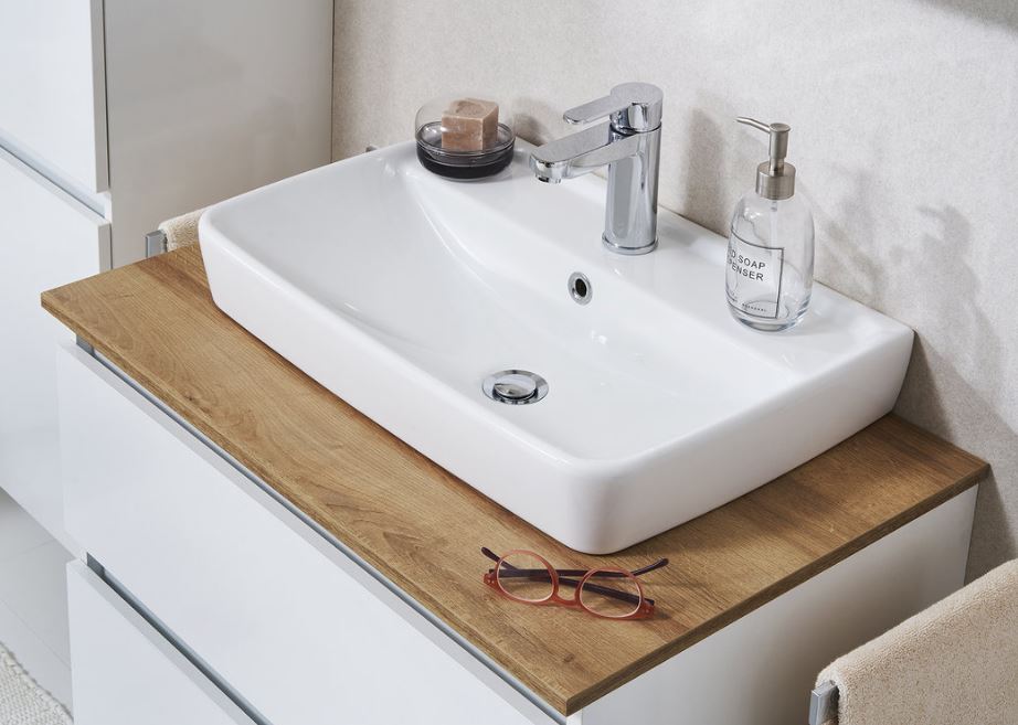 Das Set ist mit einem pflegeleichten und modernen Aufsatzbecken aus Keramik versehen. Das Becken ist 60 cm breit, 40 cm tief und 9 cm hoch.