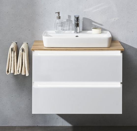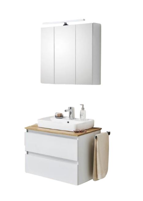 Ein 75 cm breites Badmöbelset bestehend aus einem Keramik-Aufsatzbecken, einem Unterschrank inklusive zwei Auszügen, einer Waschtischplatte sowie einem beleuchteten Spiegelschrank.