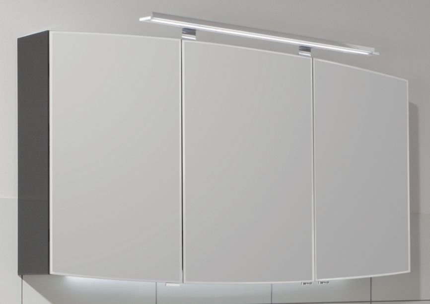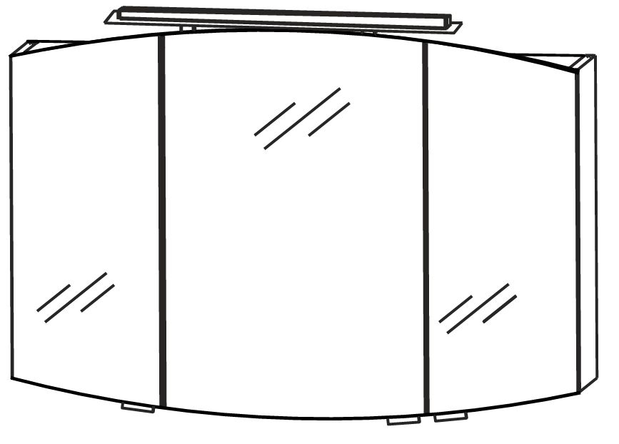 Die Spiegelfront besteht aus zwei schmalen und einer großen Tür, welche mit einem Facettenschliff versehen sind. Der Facettenschliff befindet sich entlang der Kanten und sorgt für einen schicken Akzent in Ihrem Badezimmer. Die Front ist oben und unten leicht abgerundet, was zusammen mit dem dazugehörigen Unterschrank, welcher ebenfalls diese Form hat, ein echter Hingucker in Ihrem Bad ist. Natürlich können Sie diesen Badspiegel auch mit anderen Badmöbeln kombinieren. Die Spiegeltüren sind bereits serienmäßig mit einer Türdämpfung ausgestattet, die für ein leises Öffnen und Schließen sorgen. Somit werden die Türen auch geschont und Sie dürfen eine lange Lebensdauer der Möbel erwarten. Zum Öffnen der Türen befindet sich jeweils an der Unterseite des Spiegels ein kleiner Griffblock.