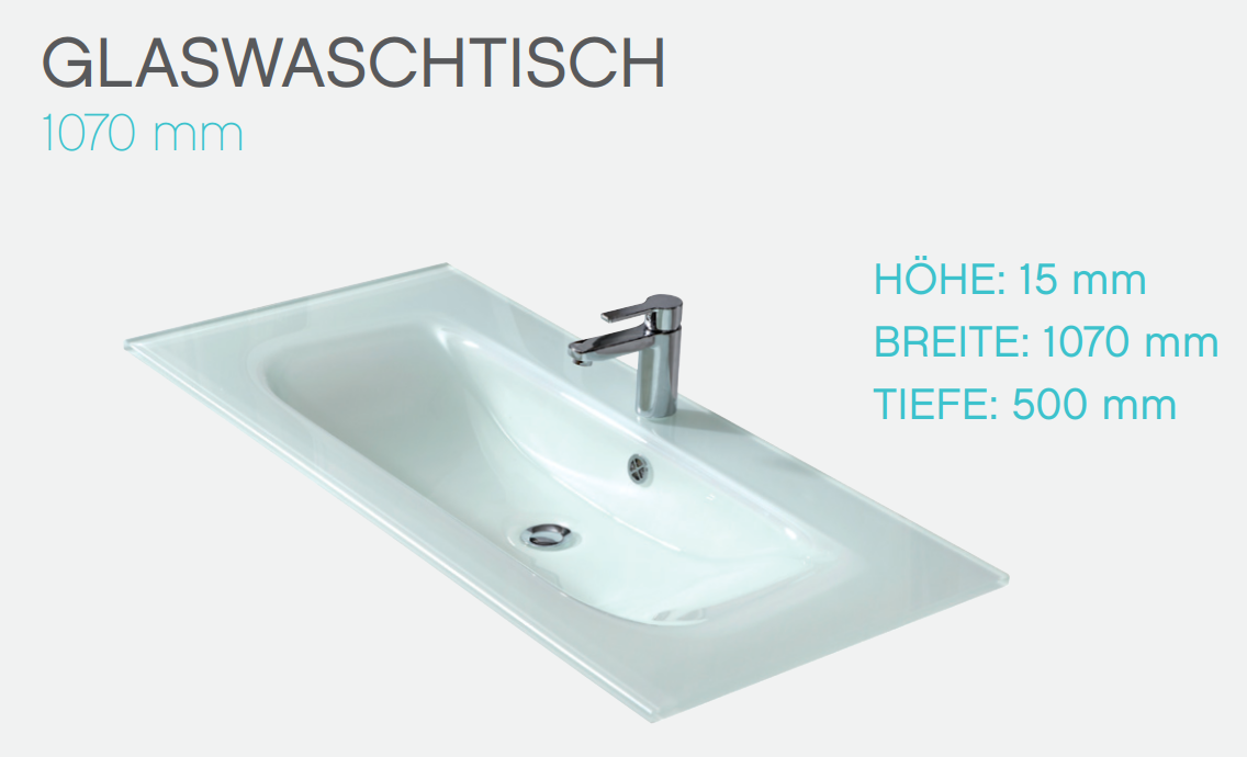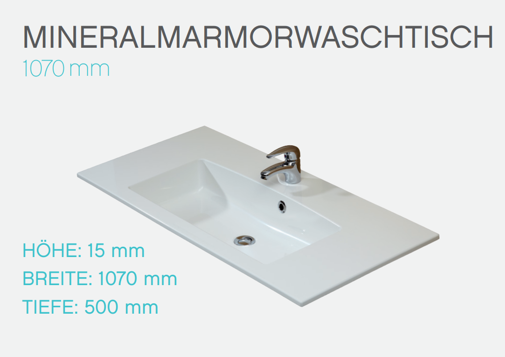 In der Breiten 107 cm haben Sie für Ihre Badmöbelset Pelipal TrenTino drei unterschiedliche Waschtischmaterialien zur Auswahl. Feines Mineralmarmor, edles Glas oder robustes Keramik. Alle drei Waschtischvarianten sind in einem zeitlosen Weiß und links und rechts des Beckens mit einer großzügigen Ablagefläche gefertigt.