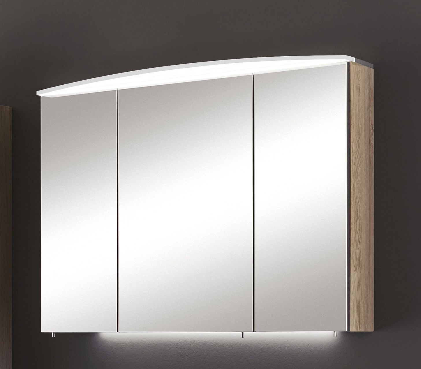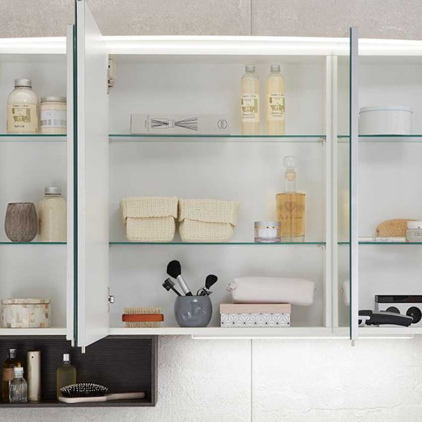 Der Marlin Bad 3040 - CityPlus Spiegelschrank 90 cm breit SAOE9 setzt sich aus 3 Spiegeltüren, gerundeter Acryloberboden mit LED-Beleuchtung und Schalter/Steckdose zusammen.