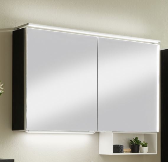 Der 120 cm breite Marlin Bad 3280 Spiegelschrank besteht aus zwei vollflächig verspiegelten Spiegeltüren, vier Glaseinlegeböden, einer seitlichen LED Beleuchtung und einem Schalter-Steckdosenelement. Der Spiegelschrank ist für Ihren Einzel-Waschtisch aus der Serie Marlin Bad 3280 in 120 cm die ideale Ergänzung. Der zweitürige Bad-Spiegelschrank kann wahlweise noch mit einer zusätzlichen Aufbauleuchte oder einer Unterbaubeleuchtung versehen werden. Diese sorgt für eine perfekte Ausleuchtung Ihres Waschtisches.