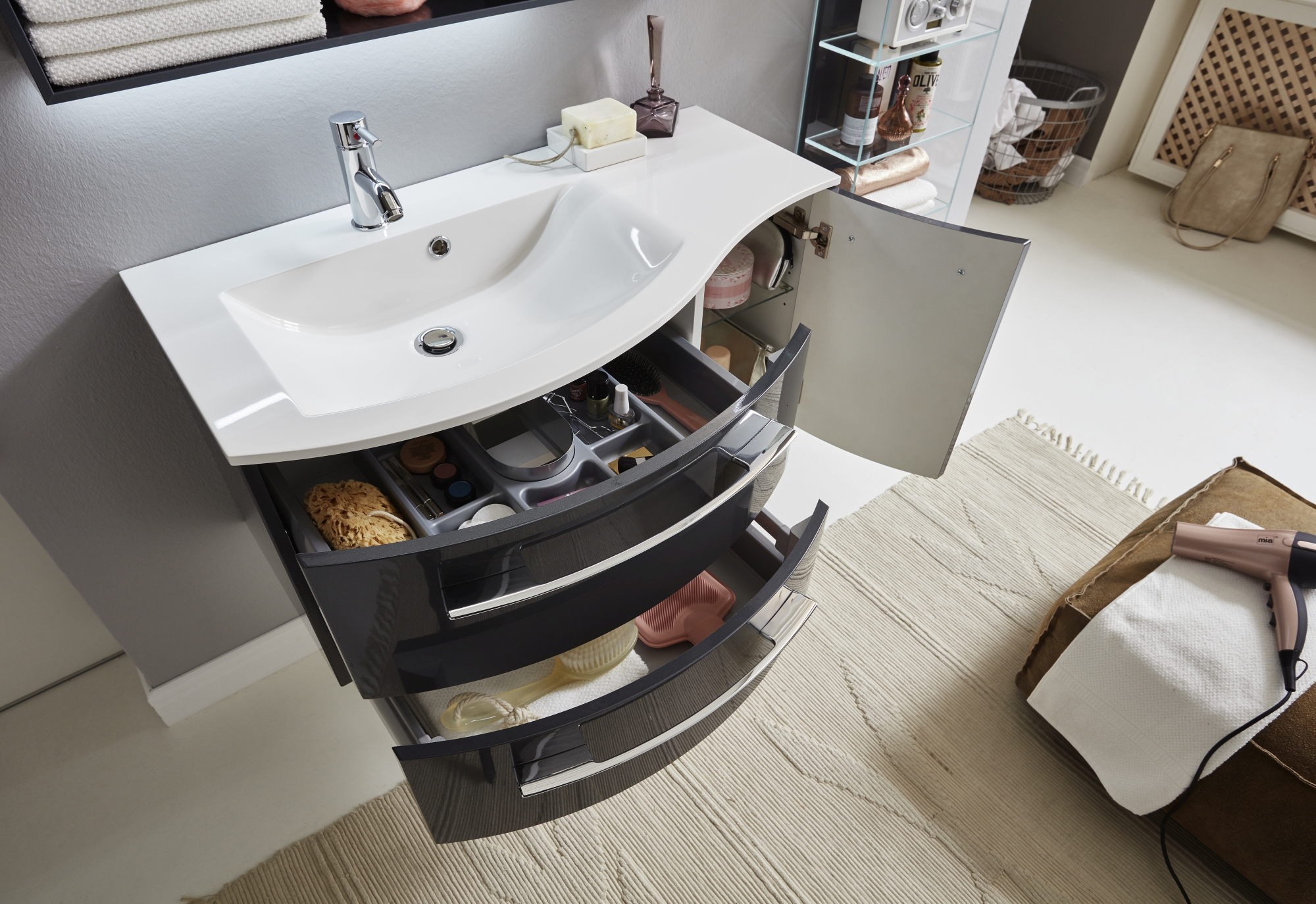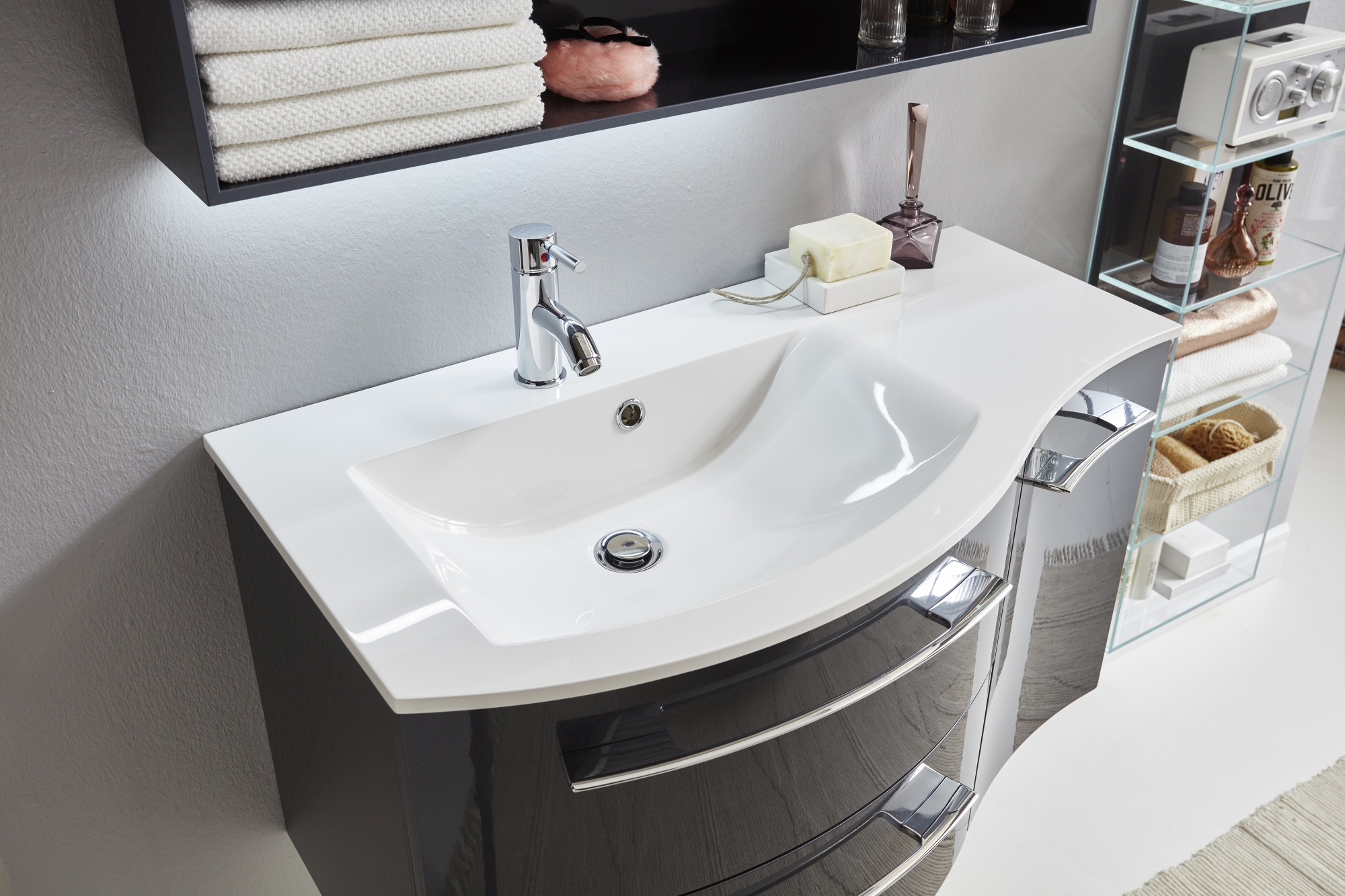 Die Marlin Bad 3280 Serie zeichnet sich durch die Griffe in Chrom Glanz sowie durch die geschwungenen und asymetrischen Formen aus. Verleihen Sie Ihrem Badezimmer einen Hauch Extravaganz! Eine große und moderne Farbauswahl für die Fronten wie den Korpus, runden dieses Modell toll ab. Wunderbar ergänzt wird Ihre Badezimmerausstattung mit einer vielseitigen Auswahl an Beimöbeln. Teilweise mit offenen Fächern ausgestattet, setzen diese Elemente Ihr Bad perfekt in Szene.