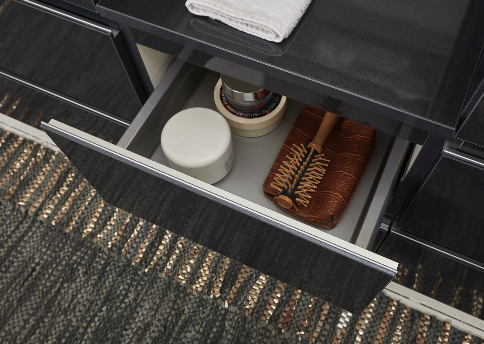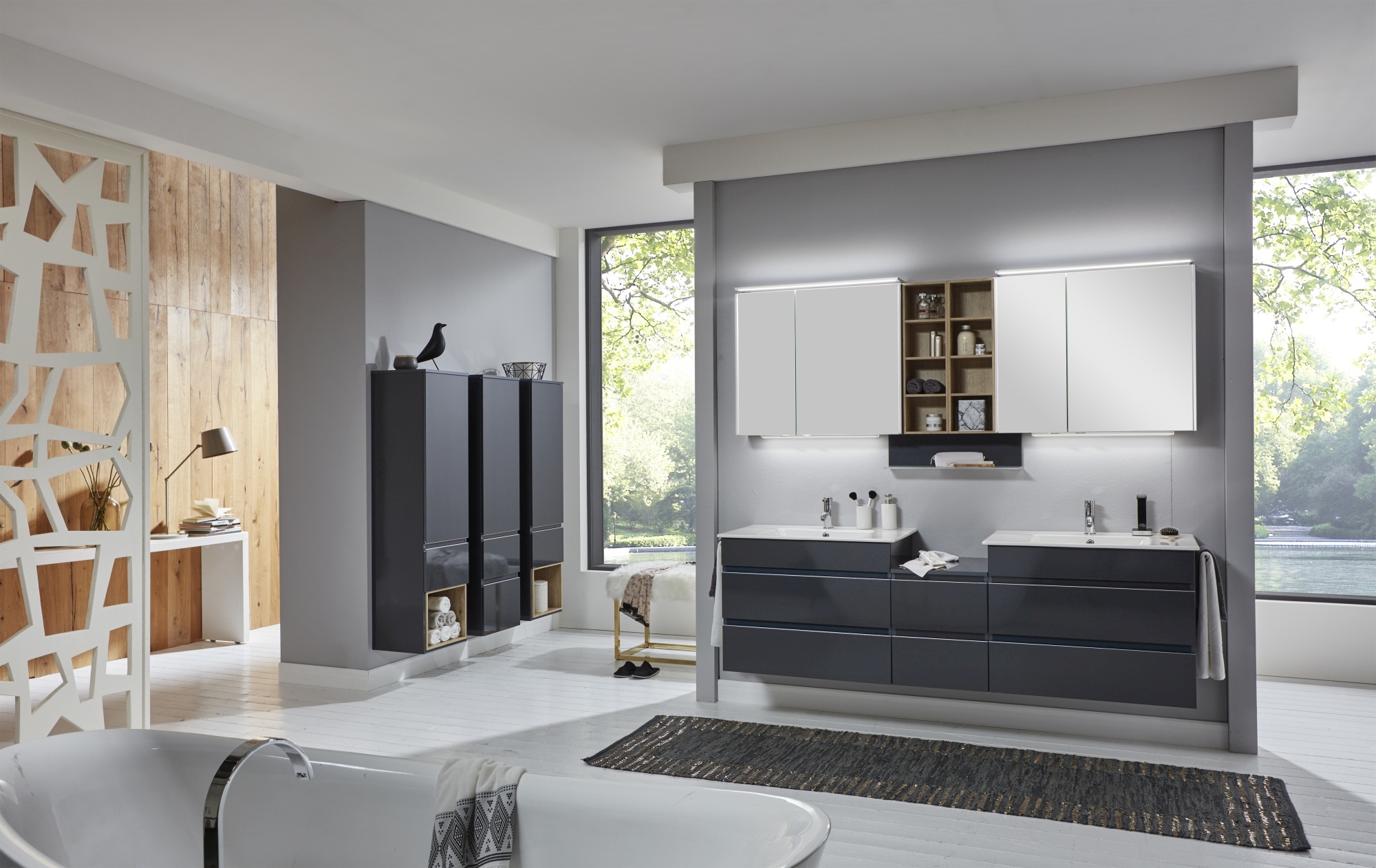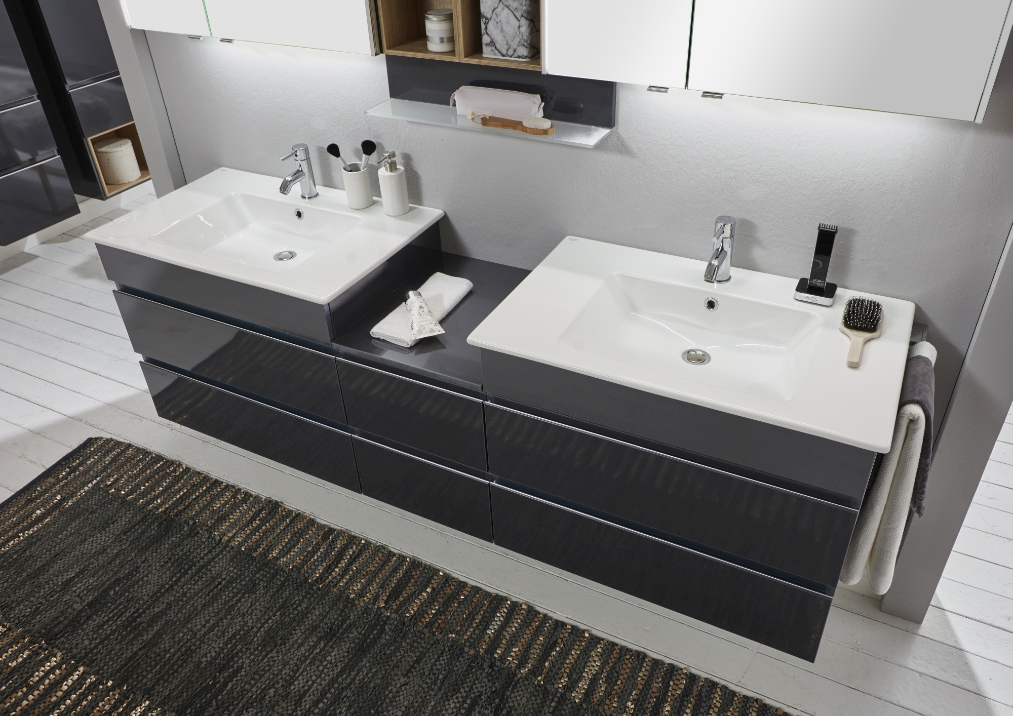 Die Badserie zeichnet sich insbesondere durch die Griffleisten in Aluminium Matt aus. Dadurch wird das Badmöbel-Design optisch abgerundet und verleiht dem Badmöbelstück den letzten Feinschliff.
