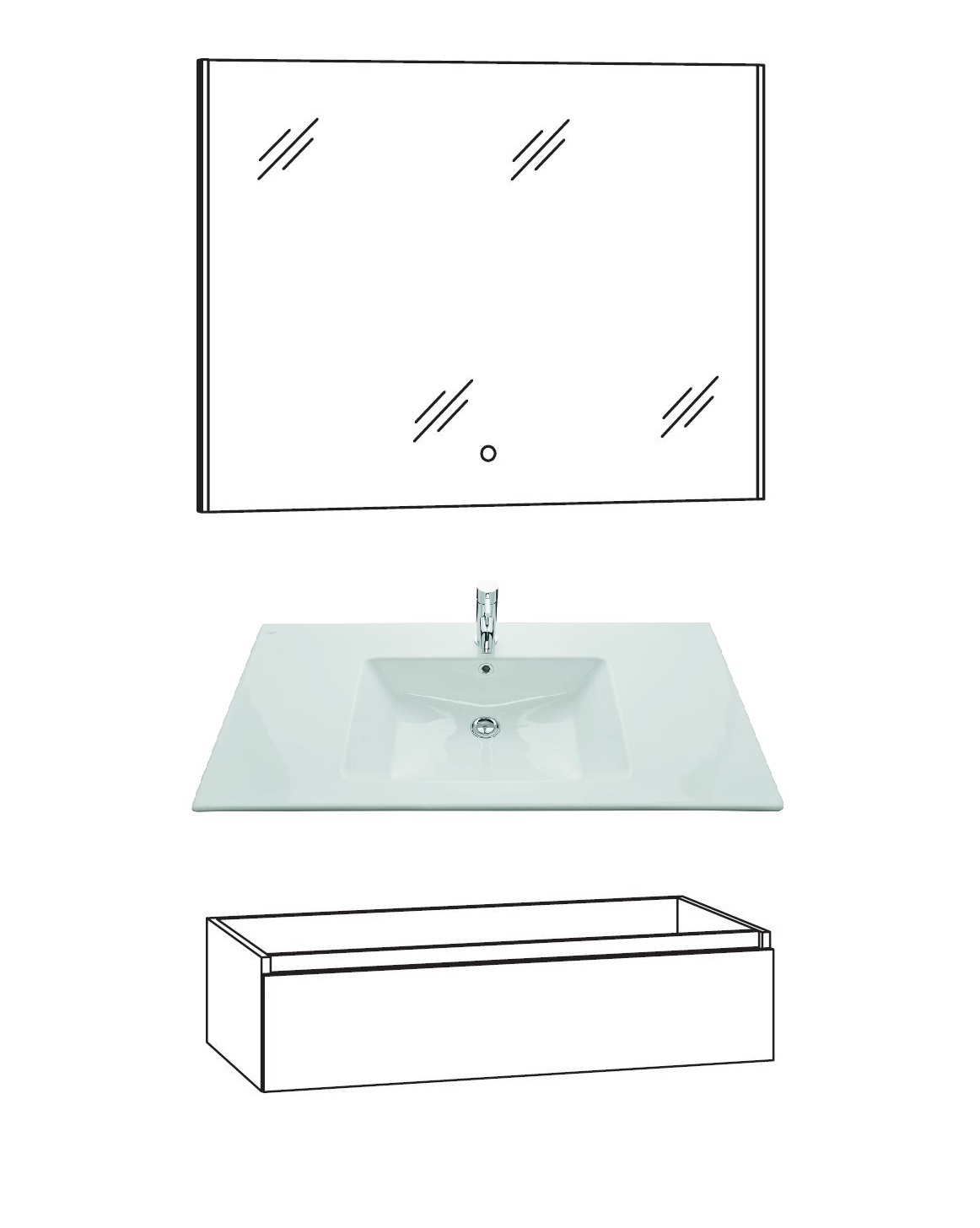Der 101 cm breite Waschtisch wird aus dem Material Keramik hergstellt und verfügt über eine Armaturbohrung und einem Überlaufloch. Unterhalb des weißen Waschbeckens befindet sich der 97 cm breite Waschtischunterschrank, welcher mit einem Schubkasten versehen ist. Optional können Sie den Unterschrank auch in anderen Varianten bestellen, diese werden in der Auswahlmöglichkeit näher dargestellt. Das Marlin Bad 3290 Badmöbel Set wird mit einem 90 cm breiten Spiegel vervollständigt. Dank der seitlichen LED Beleuchtung wird die Spiegelfront super beleuchtet und trägt zum Wohlfühl-Ambiente im Badezimmer bei. Die LED Beleuchtung wird mit Hilfe eines Sensorschalter geregelt.