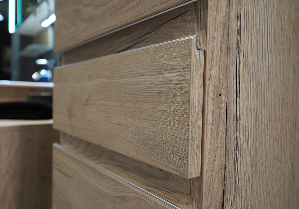 - Mitteldichte Faser Platte, formschlüssig, mit hochflexibeler Holzbeschichtung erprobt fürs Bad