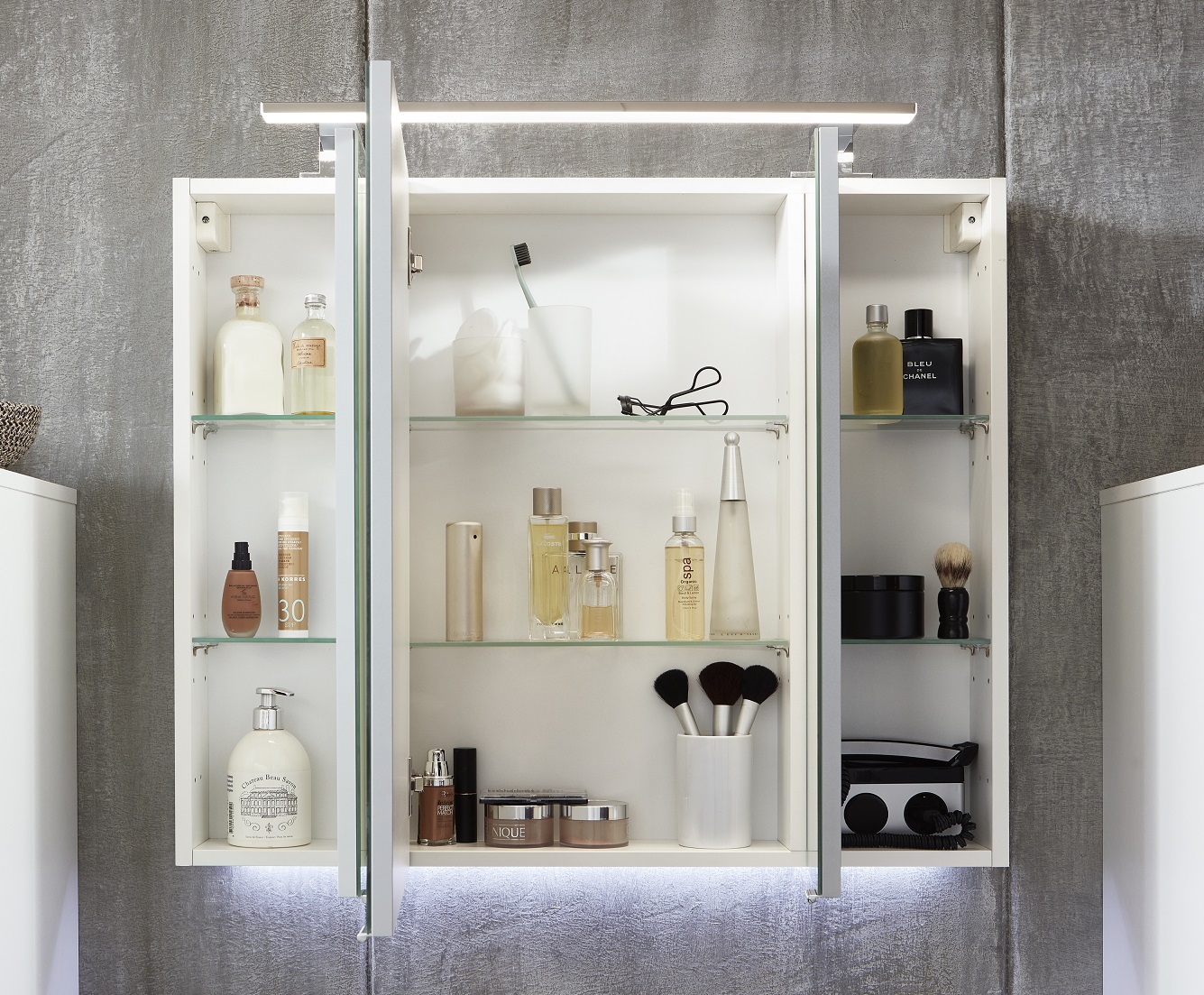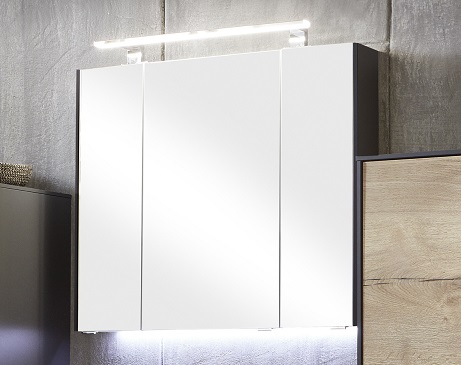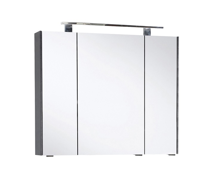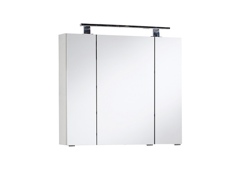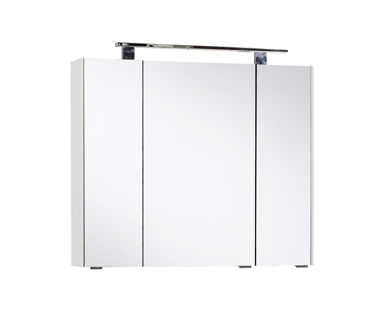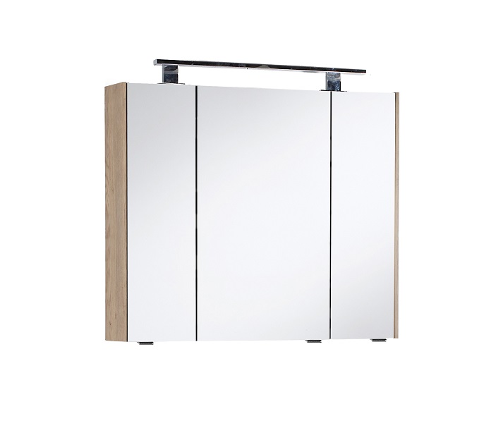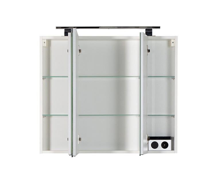 Dieser Spiegelschrank in 80 cm Breite ist ausgestattet mit 3 Spiegeltüren, hinter denen sich insgesamt 6 Glaseinlegeböden verbergen, um für perfekte Ordnung Ihrer wichtigen Badezimmerutensilien zu sorgen.