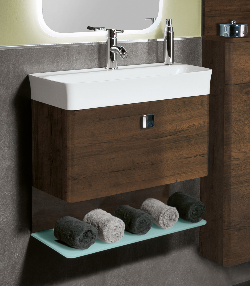 Die Farbenvielfalt der Marlin Badmöbel aus der aktuellen Badserie Gästebad 3010 bietet Raum für Individualität. Hier können Sie sich zwischen moderne Front- und Korpusfarben entscheiden. Ob zeitloses Weiß oder moderne Holztöne - Hier ist für Jeden etwas dabei. Der viereckige Griff steht neben der Funktionalität auch für das Badmöbel-Design und rundet die Optik des Badprogramms perfekt ab.