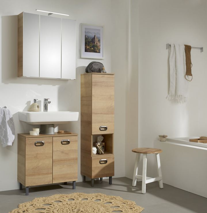 Ein praktischer Mittelschrank aus der Quickset Serie 353 von Pelipal. Der Badschrank besitzt eine Drehtüre, einen Schubkasten und ein offenes Fach. Weiter sind 2 Einlegeböden sowie Türdämpfer enthalten. Der Mittelschrank ist 30 cm breit, 122,5 cm hoch und 33 cm tief. Der Schrank kann auf Füßen oder wandhängend montiert werden. Front und Korpus sind im Farbton Riviera Eiche quer Nachbildung gehalten.