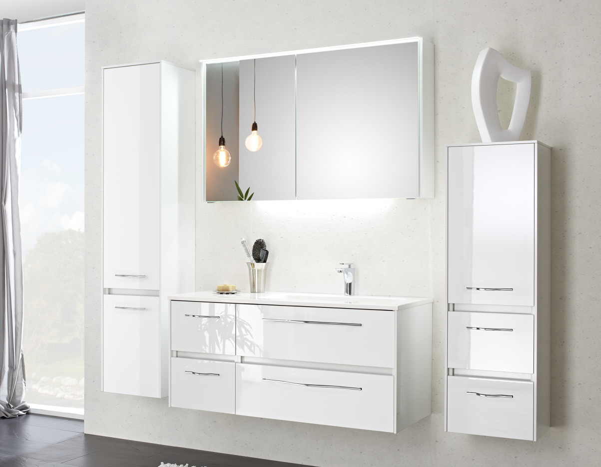 Die Besonderheit des Badmöbelprogrammes 6010 ist das grifflose Design der verschiedensten Schränke. Dies kann auch noch durch eine spezielle LED-Beleuchtung hervorgehoben werden. Gesteuert wird diese Grifffugen-Beleuchtung mit einem praktischen Bewegungssensor. Top-Modern und besonders praktisch!