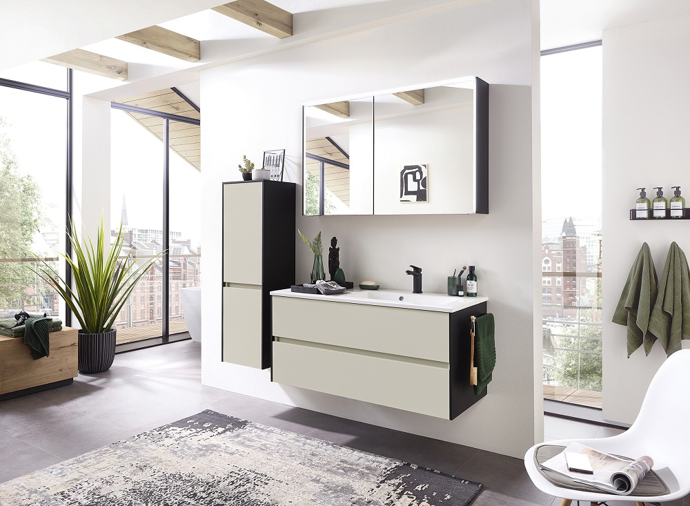 Modernes Badmöbel-Set in einer Breite von 113 cm aus der Serie Pelipal 6010 bestehend aus einem wunderschönen, asymmetrischen Becken inklusive Waschtischunterschrank und einem tollen Spiegelschrank mit eingearbeiteter LED-Beleuchtung.