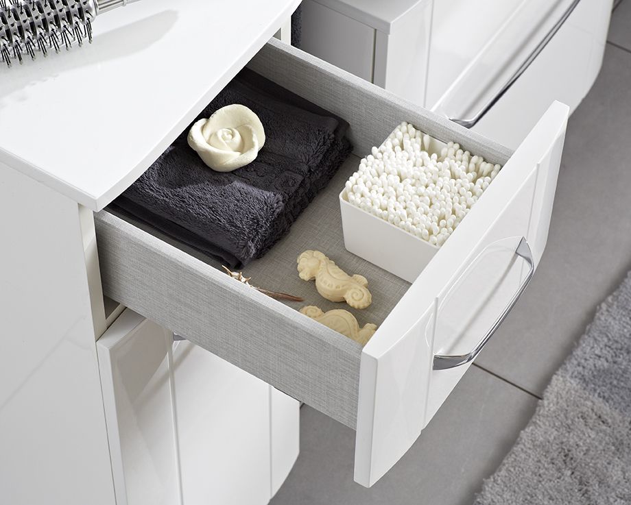 Klassisch, modern und zeitlos. Diese drei Adjektive beschreiben den Pelipal 3006 Bad-Unterschrank 993.095042 mit seiner Breite von 50 cm. Mit seinen beiden Drehtüren, welche jeweils einen Türdämpfer zum geräuschlosen Betätigen der Türen besitzen und dem oberhalb angesetzten Schubkasten plus Glaseinlegeboden ist der Unterschrank ein echter Hingucker. Da der Schrank kaum höher als ein Waschtisch mit Unterschrank aus derselben Serie von Pelipal ist, nimmt er keine zu dominierende Position am Waschplatz ein und schafft dennoch ein weiteren Stauraum für Handtücher, Badezusätze oder andere Badartikel. Erwähnenswert ist die Abdeckplatte, auf welcher man optimal bestimmte Bad-Accessoires in Szene setzen kann. Korpus und Front sind vom Werk vormontiert, sodass eine schnelle Selbstmontage möglich ist, bei welcher Sie entscheiden können, ob Sie Ihren Bad-Unterschrank lieber hängend oder stehend in Ihr Badezimmer einfügen wollen.