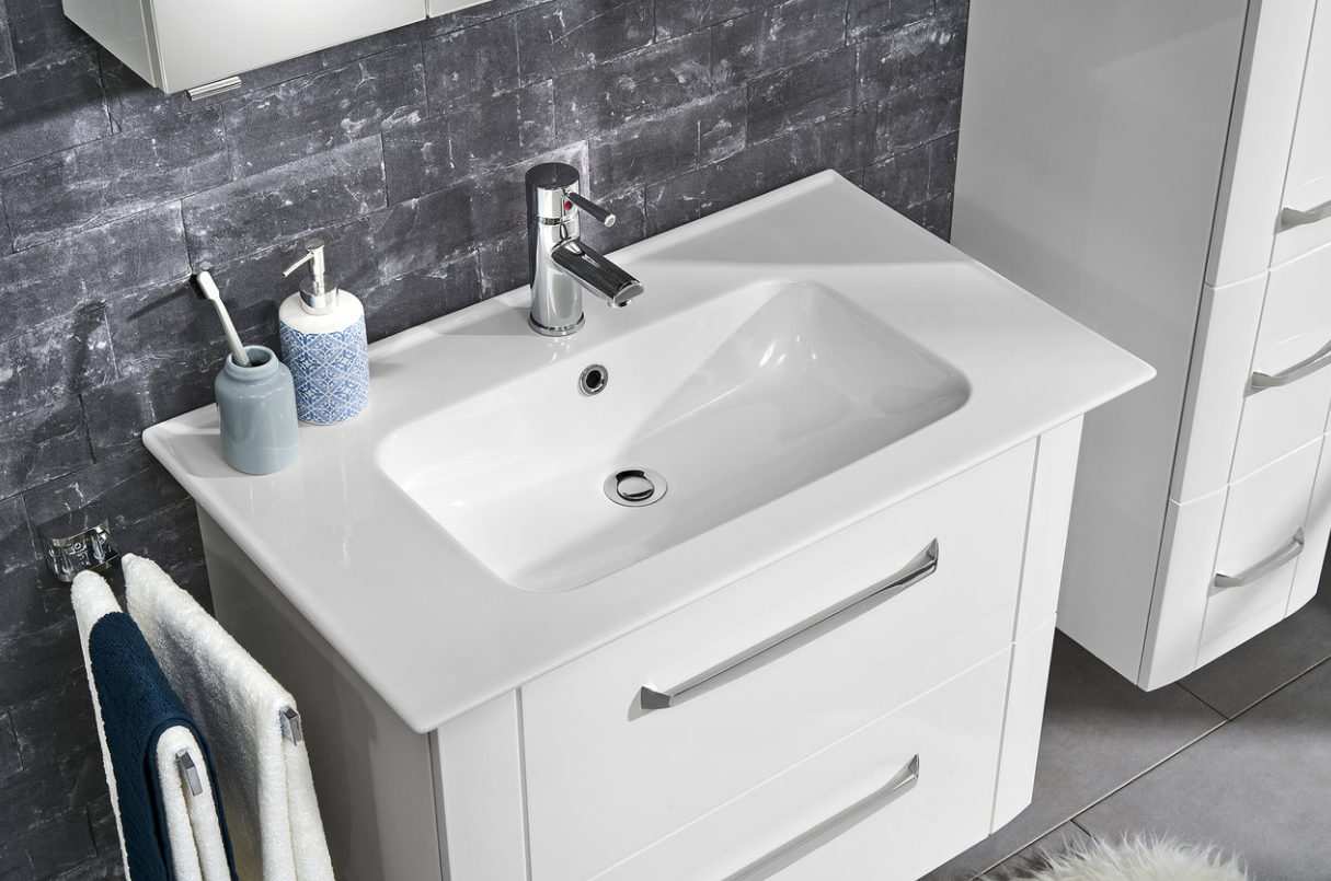 Der Pelipal 3006 Waschtisch mit Unterschrank ist 80 cm breit und sowohl Korpus-, als auch Frontfarbe sind in einem edlen Lack-Weißton gehalten.