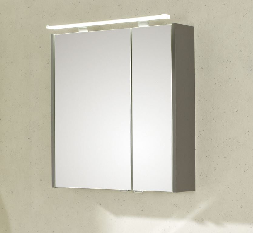 Der Spiegelschrank mit LED-Aufsatzleuchte ist 66 cm breit und ergänzt das Badmöbel Set auf ideale Weise. Er ist mit zwei einfach verspiegelten Drehtüren, zwei Glaseinlegeböden sowie einem Schalter und Steckdose unten rechts komfortabel ausgestattet. Die 12V / 9W LED-Aufsatzleuchte sorgt für ein helles und freundliches Ambiente und beleuchtet die Spiegelflächen sowie den Waschplatz. Die Aufsatzleuchte hat eine Energieeffizienz der Klasse A++-A.