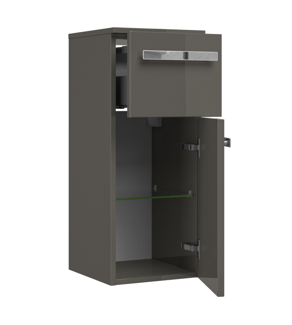 Das Pelipal 4005 Highboard ist 30 cm breit und eine schmückende Vervollständigung Ihres Badezimmers. Mit Hochglanz lackiert - in weiß oder steingrau - wirkt das Highboard sehr edel und passt zu den Badmöbel Sets der Serie 4005. Aber auch in einem tollen Holzdekor in Eiche oder Graphit kann es sich sehen lassen. Ein Auszug und eine darunter anschließende Drehtür - wählbar mit linkem oder rechtem Türanschlag - mit Glaseinlegeboden zur Unterteilung des Stauraums im Inneren des Artikels gehören zur Ausstattung des Highboards. Auf der Abdeckplatte können Sie ausgewählte Badprodukte gekonnt in Szene setzen. Chromfarbene Bügelgriffe vollenden das Produkt.