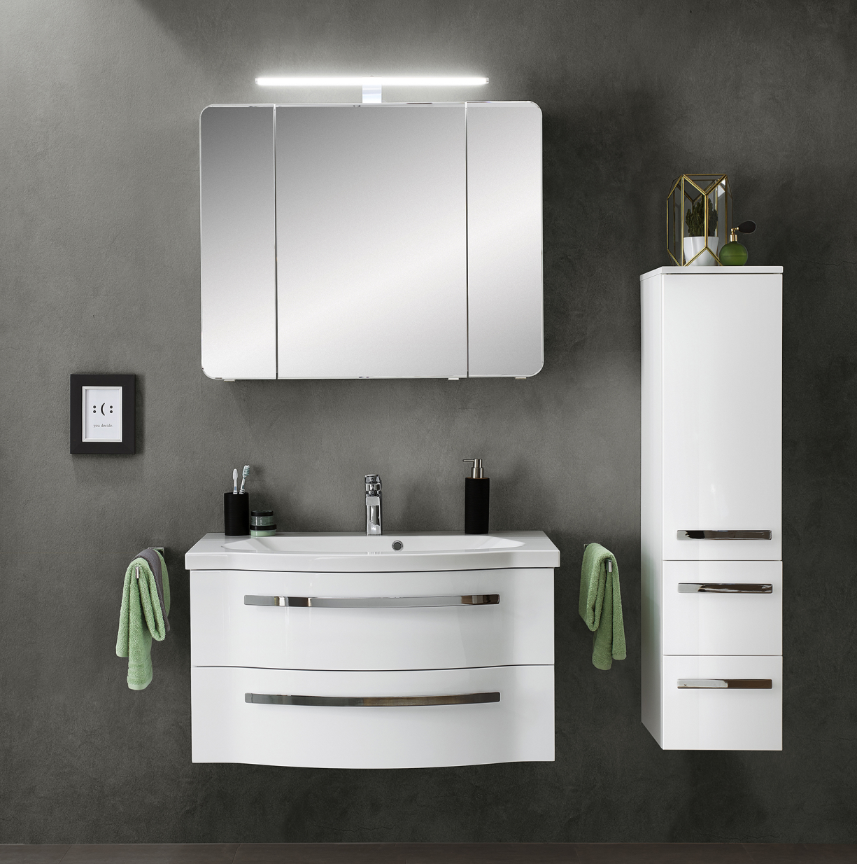 Abgebildete Dekorationsartikel, Beistellschränke sowie Armaturen sind nicht im Lieferumfang enthalten und müssen ggf. separat bestellt werden.