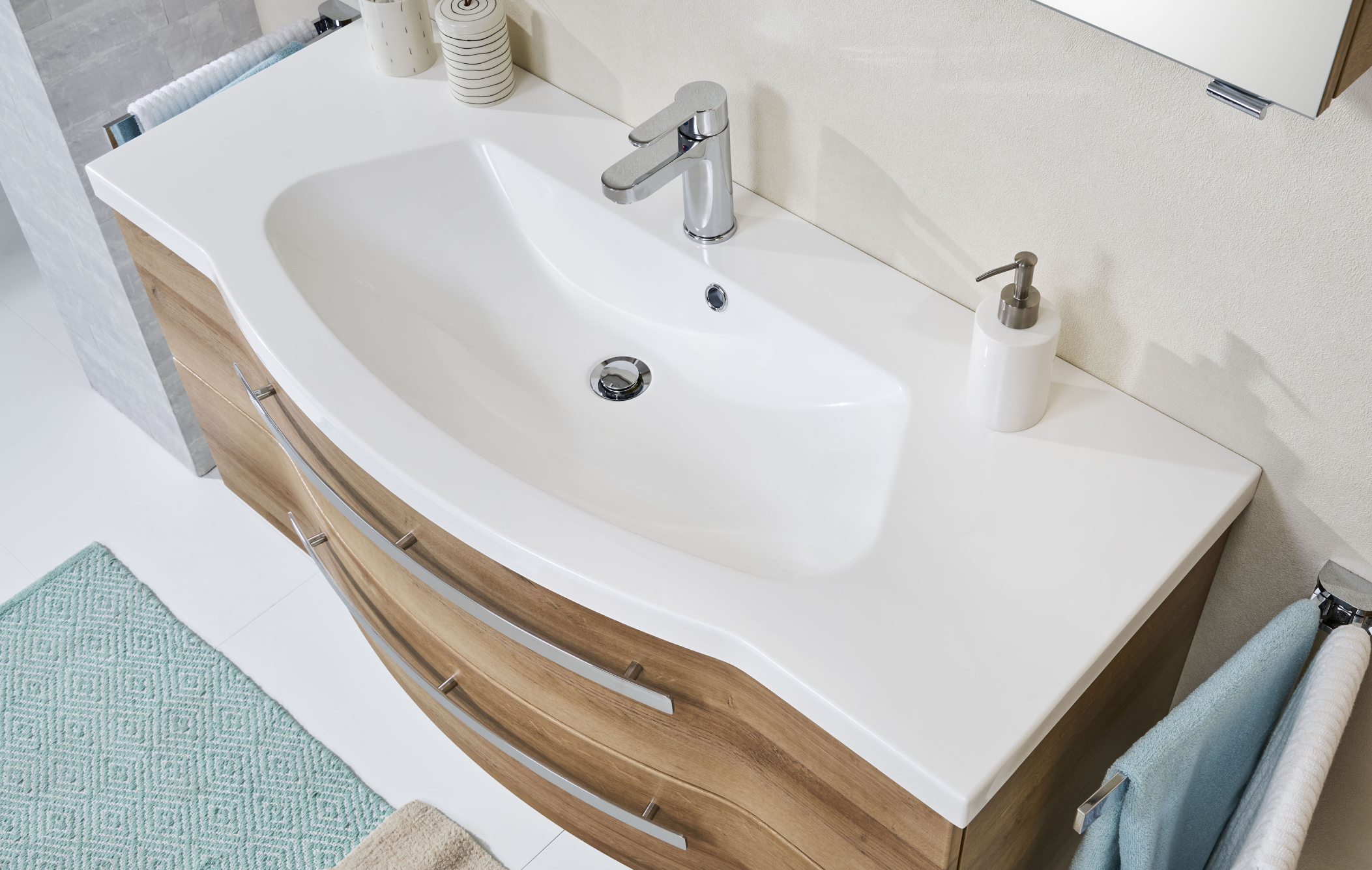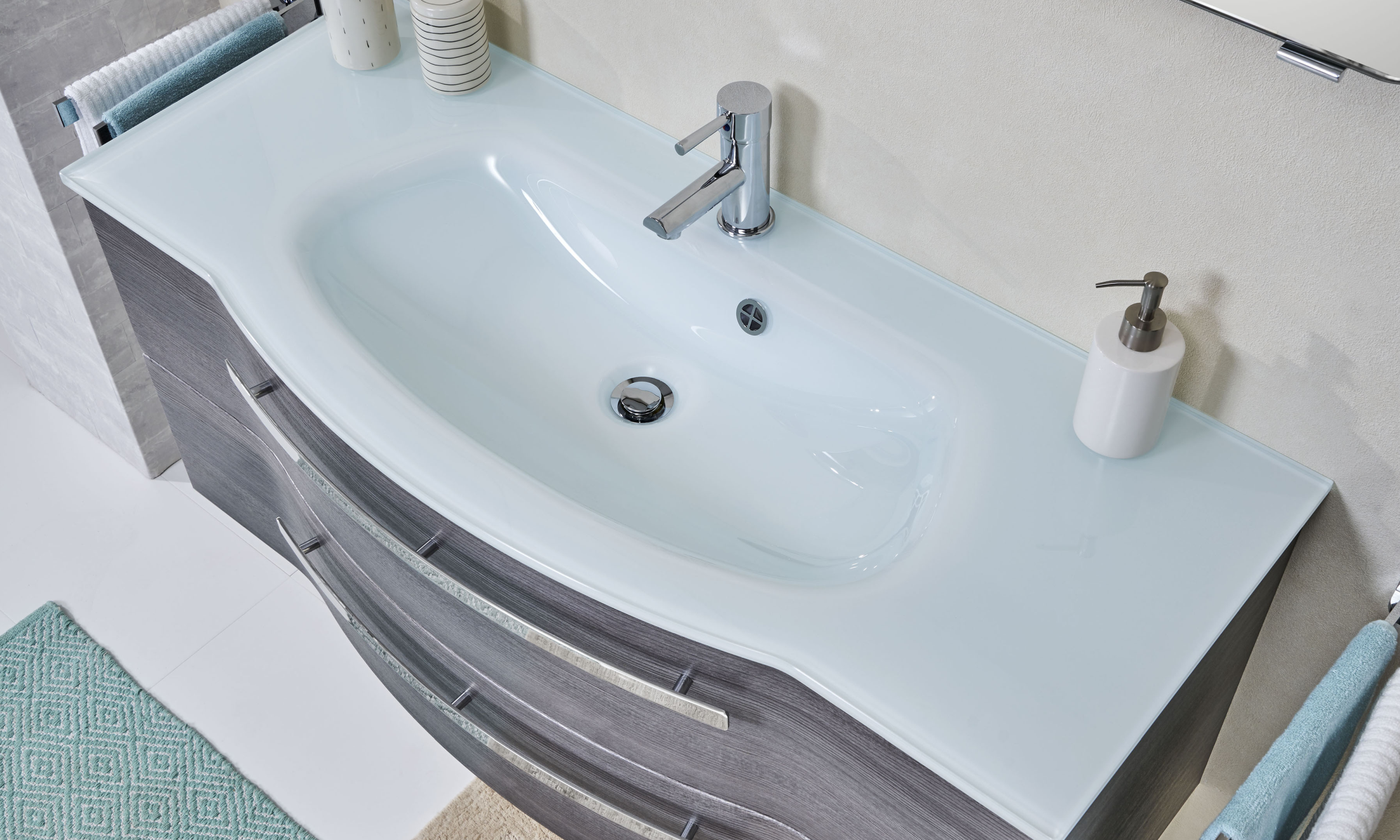 Die Grundvariante des Sets beinhaltet einen Mineralmarmor-Waschtisch, der auf Grund seiner belastbaren Oberfläche optimal für den Einsatz im Bad geeignet ist. Eine Armaturbohrung und ein integrierter Überlauf sind im Lieferumfang enthalten. Wahlweise können Sie dieses Waschbecken mit einer wunderschönen LED-Zusatzbeleuchtung für die Schatttenfuge erwerben, welche sich mit einem Bewegungssensor bequem steuern lässt. Die Unterbodenbeleuchtung, mit welcher Sie warme Lichteffekte in Ihrem Badezimmer erreichen, ist ausschließlich mit dem Mineralmarmor-Waschtisch erhältlich. Als Alternative zum eben beschriebenen Waschbecken, steht Ihnen ein Glaswaschtisch zur Auswahl, welcher Klarglas weiß lackiert ist und sich zudem leicht reinigen lässt. Beide Varianten überzeugen nicht nur durch ihr modernes abgerundetes Design, sondern auch durch ihre praktischen großen Ablageflächen rechts und links neben dem Becken, auf welchen Sie wichtige Bad-Accessoires abstellen können.