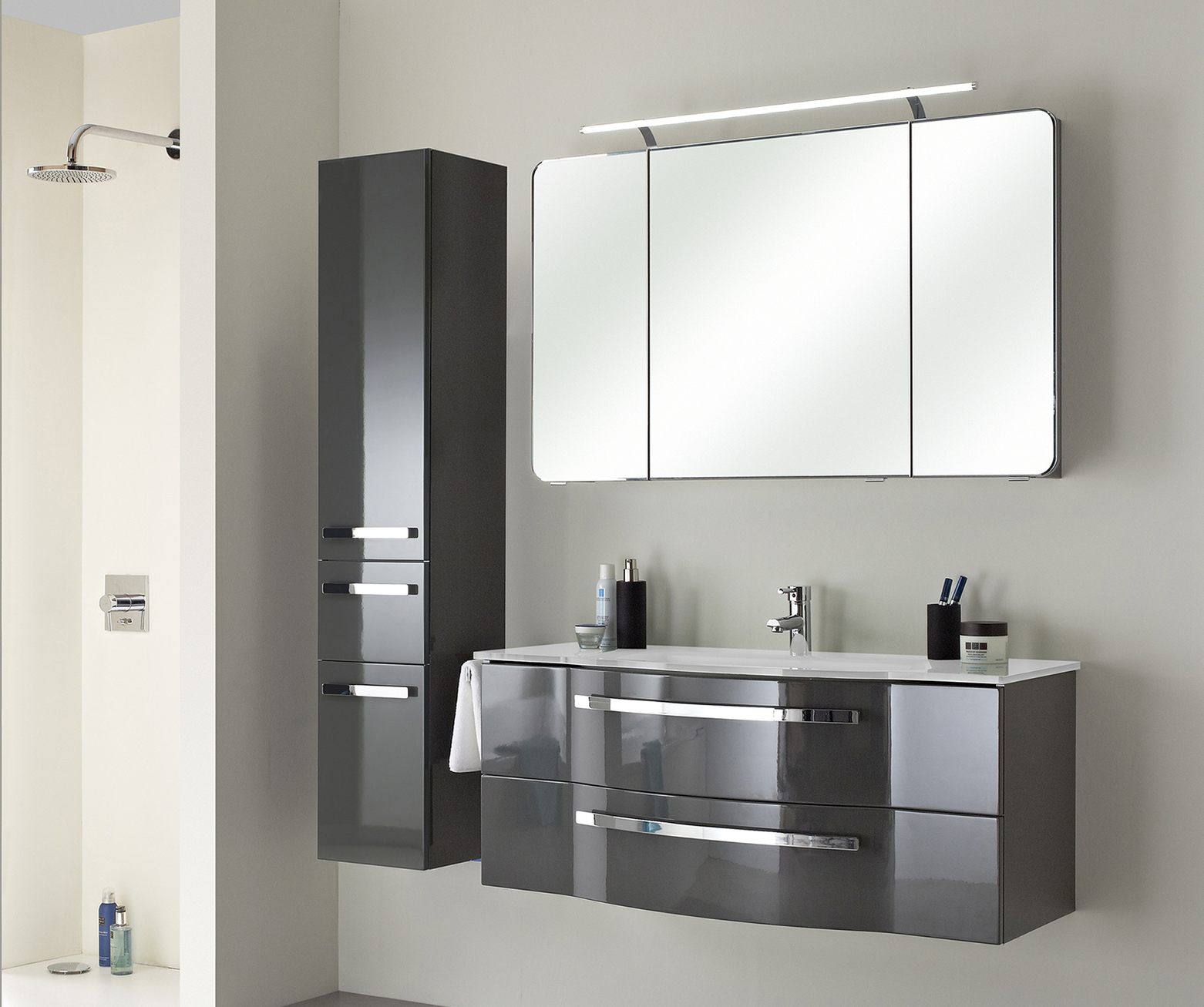Alle Badmöbel des Sets sind in Lack Steingrau Hochglanz oder Lack Weiß Hochglanz erhältlich und den angebotenen Beistellschränken kombinierbar.