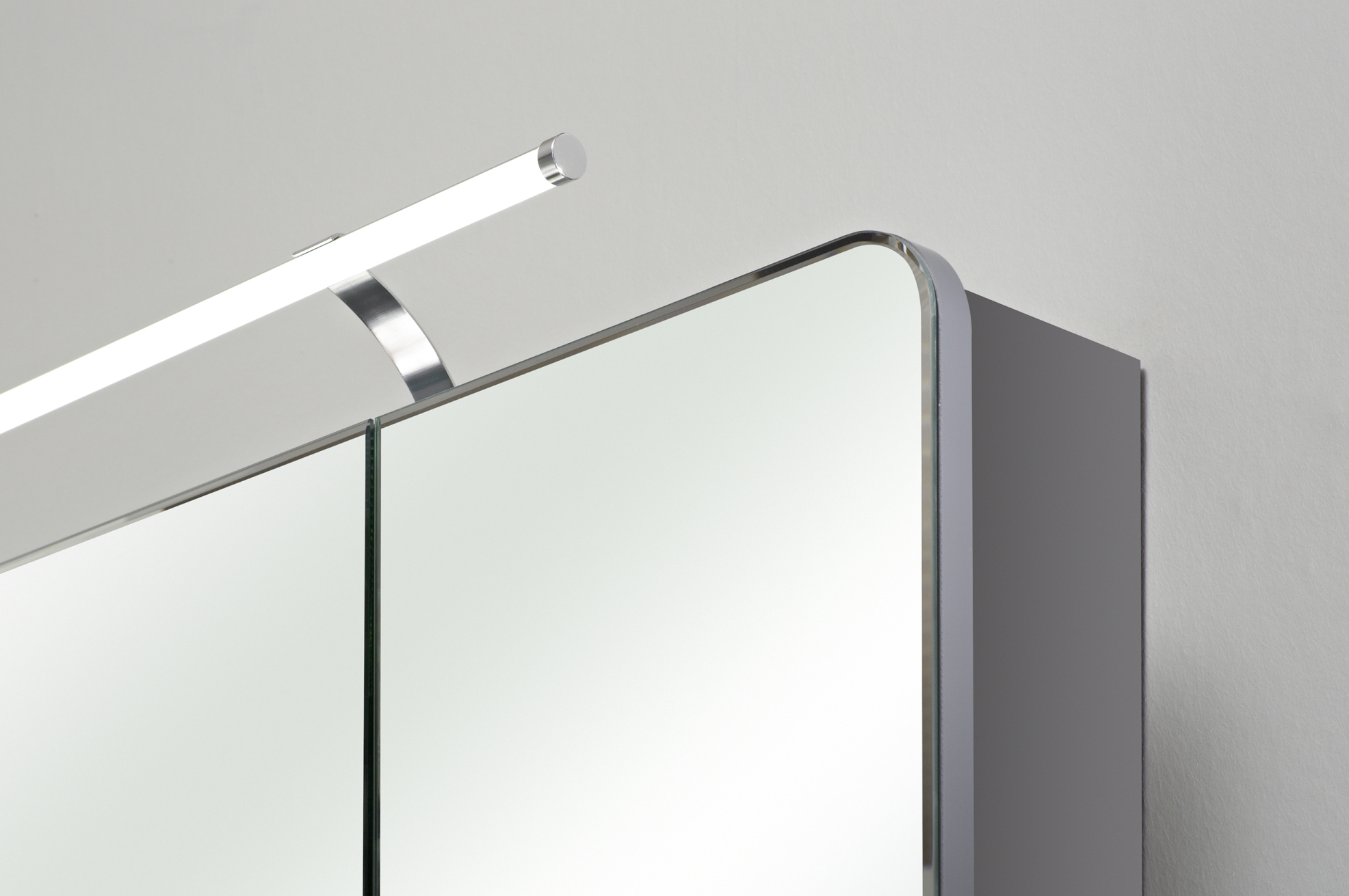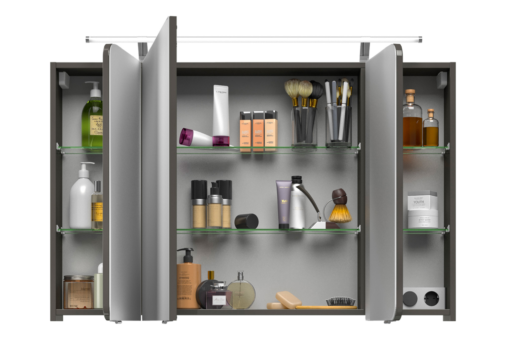 Der Spiegelschrank rundet das Badmöbel Set ab und ist mit drei einfach verspiegelten Drehtüren, sechs Glaseinlegeböden zur Unterteilung des Innenraums des Spiegels, einem Schalter mit Steckdose und einer LED-Leuchte ausgestattet. Es obliegt Ihnen, eine Aufsatzleuchte oder eine LED-Beleuchtung im Kranz zu erwerben. Beide garantieren, dass Sie bei Ihrem täglichen Stylingprogramm ausreichend Licht am Waschplatz zur Verfügung haben.