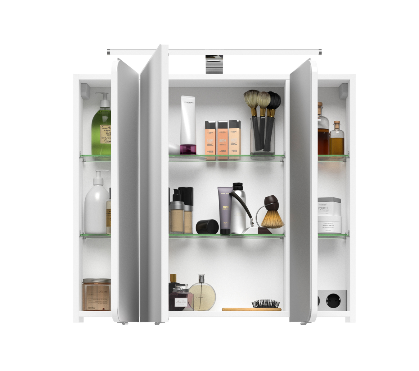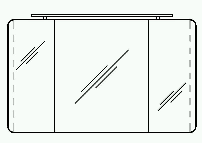 Der Spiegelschrank rundet das Badmöbel Set ab und ist mit drei einfach verspiegelten Drehtüren, sechs Glaseinlegeböden zur Unterteilung des Innenraums des Spiegels, einem Schalter mit Steckdose und einer LED-Leuchte ausgestattet. Es obliegt Ihnen, eine Aufsatzleuchte oder eine LED-Beleuchtung im Kranz zu erwerben. Beide garantieren, dass Sie bei Ihrem täglichen Stylingprogramm ausreichend Licht am Waschplatz zur Verfügung haben.