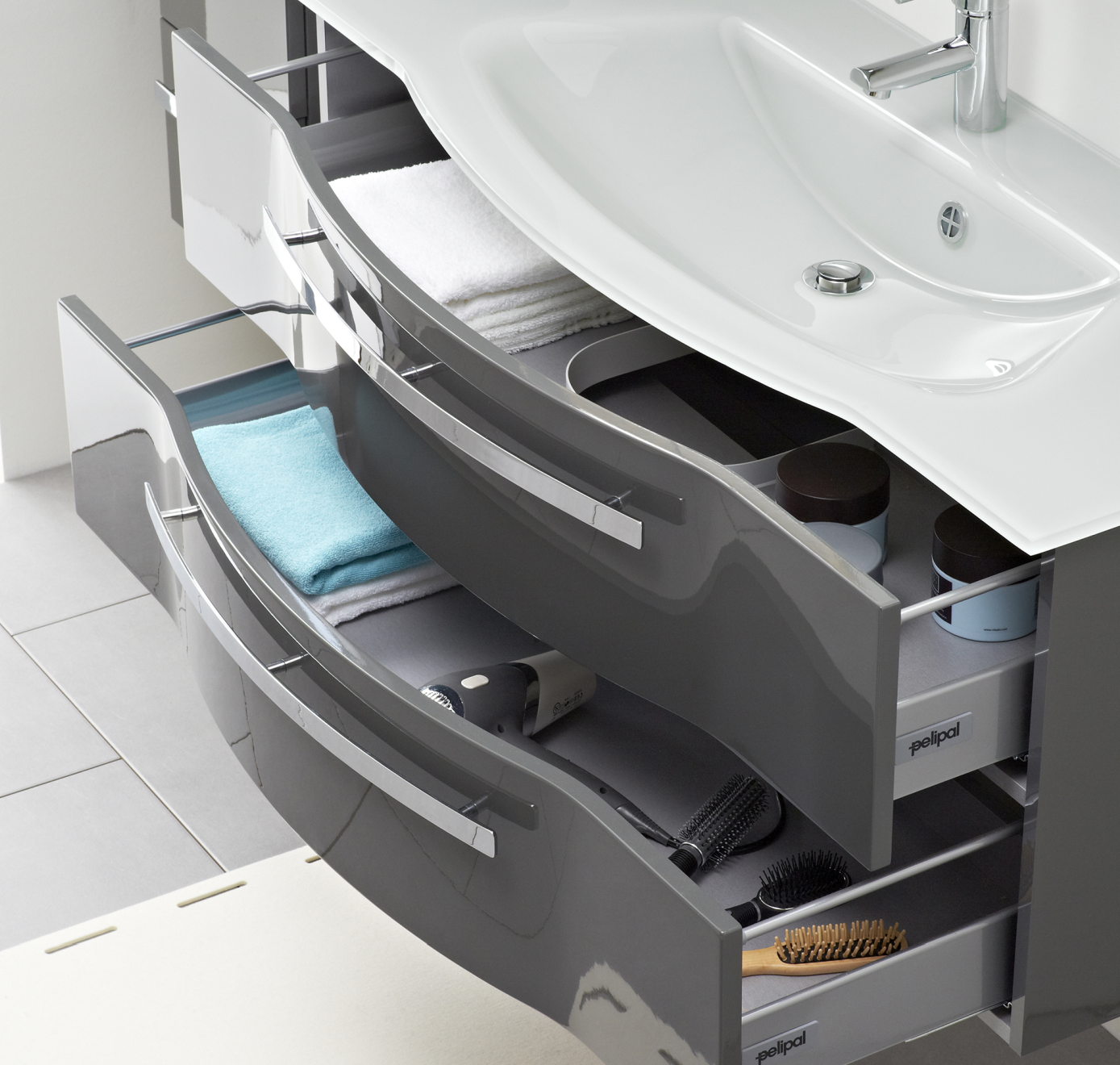 Die Waschtisch-Unterschränke, die sich toll an die Fromgebung der Waschbecken anschließen verfügen über zwei große Auszuüge. Dort lassen sich Pflegeprodukte oder Putzmittel verstauen. Sie können zwischen einer polarweißen und einer steingrauen Lackierung der Oberfläche wählen.