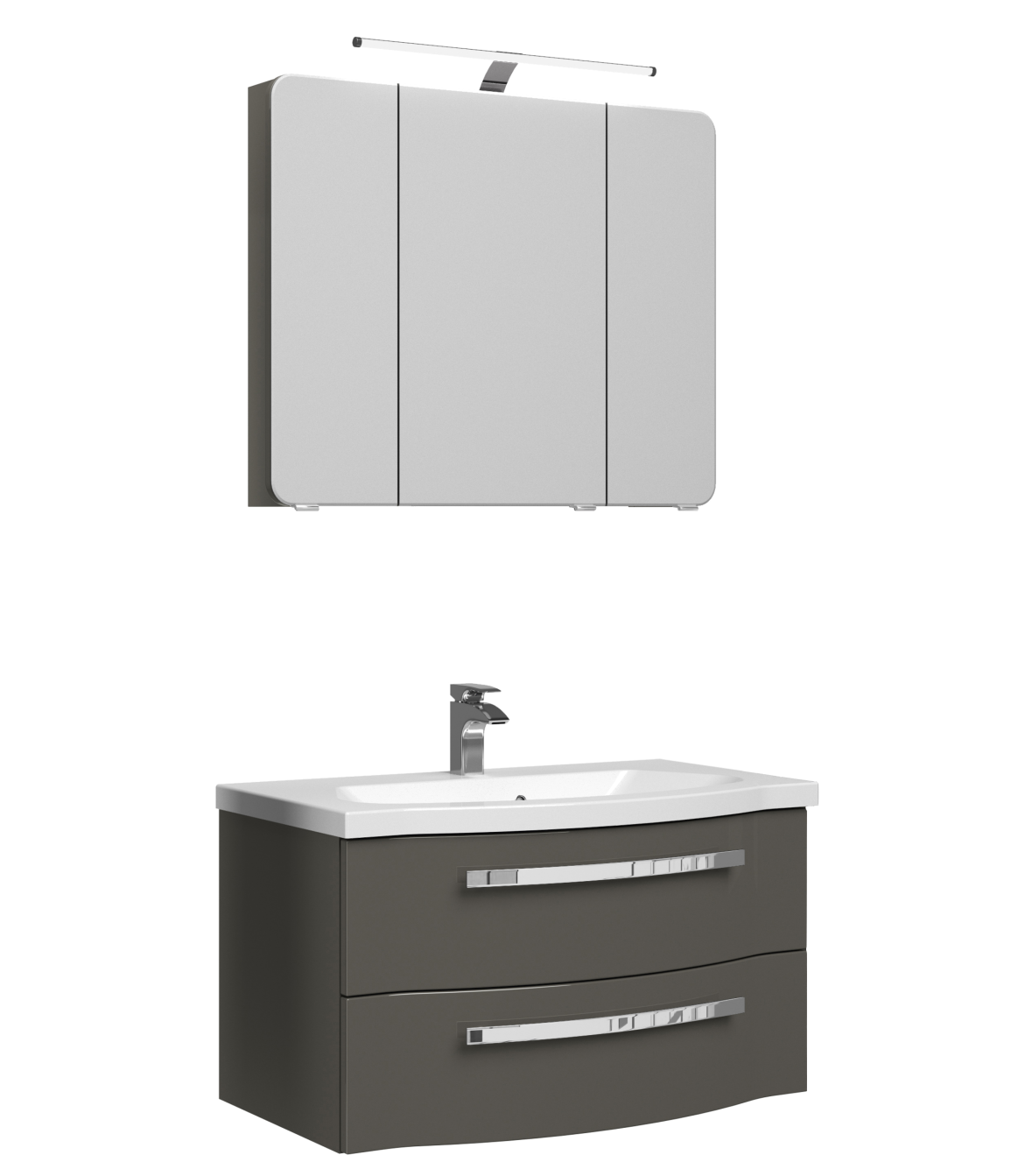 Alle Badmöbel des Sets sind in Lack Steingrau Hochglanz oder Lack Weiß Hochglanz erhältlich und den angebotenen Beistellschränken kombinierbar.