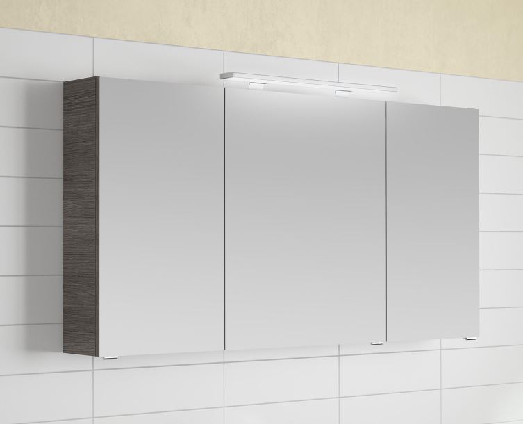 Der 120 cm breite Pelipal 4010 Spiegelschrank 4850._1250 ist 70,3 cm hoch und 17 cm tief. Mit drei einfach verspiegelten Drehtüren, sechs Glaseinlegeböden sowie einem Schalter und einer Steckdose ist er sehr gut ausgestattet. Schalter und Steckdose sind hinter der rechten Drehtür unten untergebracht und von dort aus sehr gut zu bedienen. Der Innenraum des Spiegelschrankes kann mit Hilfe der sechs Glaseinlegeböden sehr gut unterteilt werden und bietet Ihnen genügend Platz um Ihre täglichen Pflegeprodukte übersichtlich unterzubringen. Der Pelipal 4010 Spiegelschrank 4850._1450 ist hier mit einer modernen 12 V Aufsatzleuchte ausgestattet. Diese garantiert eine bestmögliche Ausleuchtung der Spiegelflächen und sorgt für genügend Licht am Ihrem Waschplatz. Die LED-Aufsatzleuchte hat eine Breite von 90 cm und eine Energieeffizienz der Klasse A++ - A.