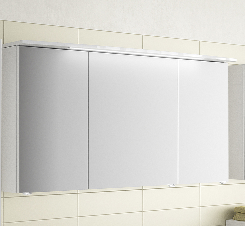 Der 140 cm breite Pelipal 4010 Spiegelschrank 4850._1450 ist 71,9 cm hoch und 17 cm bzw. mit Kranz 26,5 cm tief. Ausgestattet ist er mit drei einfach verspiegelten Drehtüren, sechs Glaseinlegeböden sowie mit einer Steckdose und einem Schalter. Das Steckdosen-Schalter-Modul ist hinter der rechten Drehtür unten untergebracht und von dort ausgezeichnet zu bedienen. Der Innenraum des Spiegelschrankes bietet viel Platz für Ihre täglichen Pflegeprodukte sowie Utensilien und kann mit Hilfe der sechs Glaseinlegeböden übersichtlich unterteilt werden. Der Pelipal 4010 Spiegelschrank 4850._1450 ist in dieser Variante mit einer im Kranz integrierten 12 V TwinLED-Beleuchtung ausgestattet. Diese gewährleistet eine gute Ausleuchtung der Spiegelflächen und sorgt für genügend Licht am Ihrem Waschplatz. Der Kranz mit LED-Beleuchtung hat eine Breite von 142 cm und eine Energieeffizienz der Klasse A++ - A.