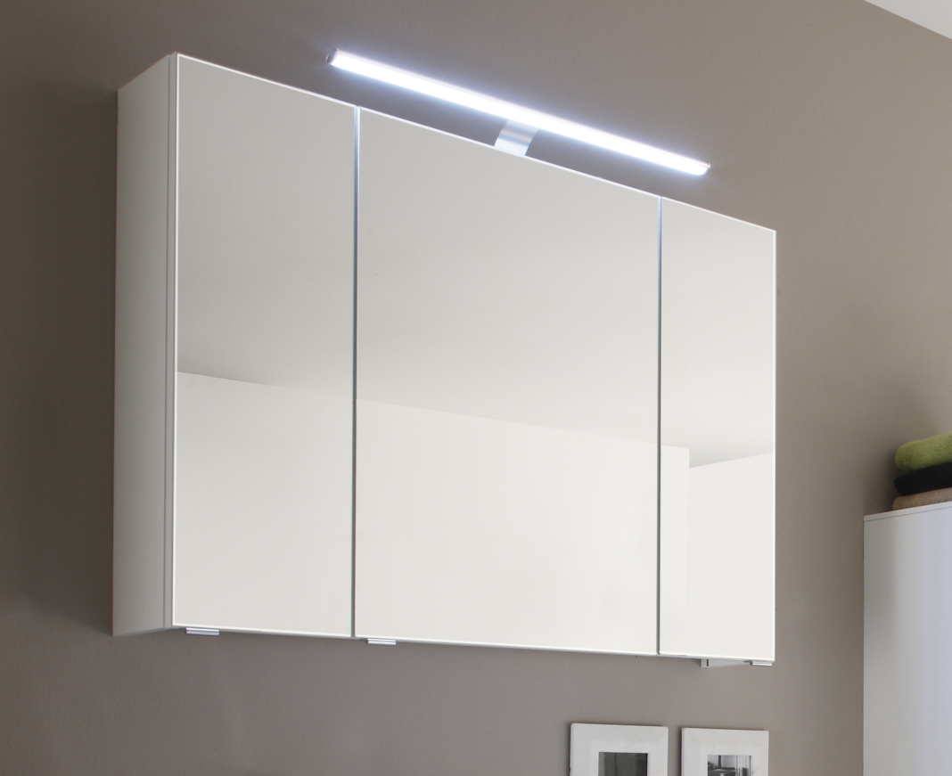 Im Badmöbel-Set von Pelipal 6005 ist ein Keramik-Waschbecken mit Unterschrank sowie einem dreitürigen Spiegelschrank mit LED-Aufsatzleuchte enthalten. Der 97 cm breite Pelipal 6005 Spiegelschrank ist mit drei Spiegeltüren, angebracht auf einer Trägerplatte, drei Einlegeböden aus Glas, einem Schalter-Steckdosenelement sowie einer effektiven LED-Aufbauleuchte ausgestattet. Mit Hilfe der drei Einlegeböden wird der Innenbereich beim Spiegelschrank optimal unterteilt, sodass man einen guten Überblick über die einsortierten Pflegeartikel hat. Die 7W LED-Aufsatzleuchte ist waagerechte und leicht nach vorne gebeugt angebracht was eine optimale Ausleuchtung der Spiegelfronten bewirkt. Neben dem modernen Spiegelschrank enthält das Badmöbel Set Pelipal 6005 ein wunderschönes Keramik-Becken inklusive Wachtischunterschrankes.