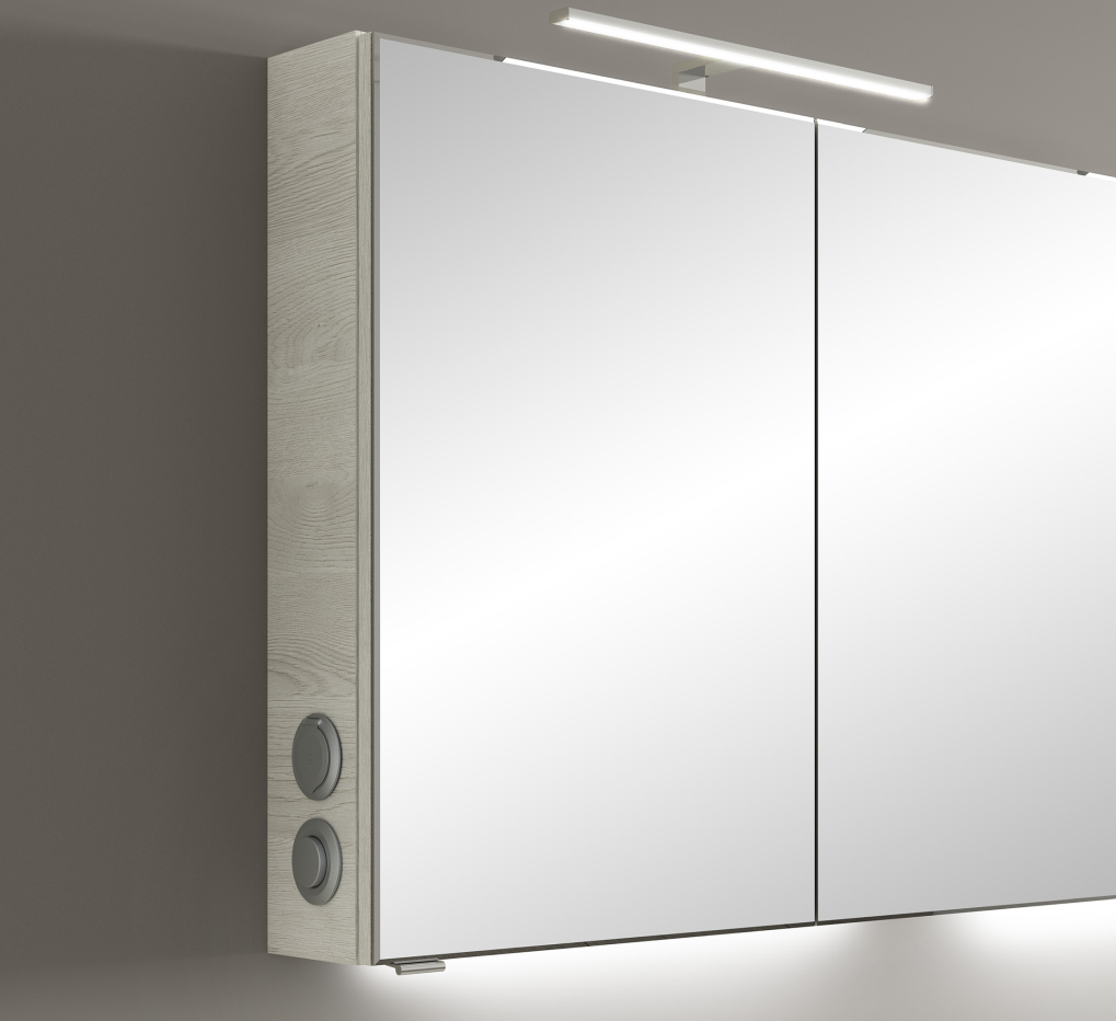 Als Besonderheit bietet Ihnen hier Pelipal die Position des Schalter-Steckdosen-Moduls selber zu bestimmen. In der Grundvarianten ist diese immer hinter der rechten Spiegeltüre innenliegend (AG-SPS 01). Für einen kleinen Aufpreis kann es jedoch auch außen am Korpus eingearbeitet werden. Links, rechts oder unten (AG-SPS 26) - ganz nach Ihren Wünschen!