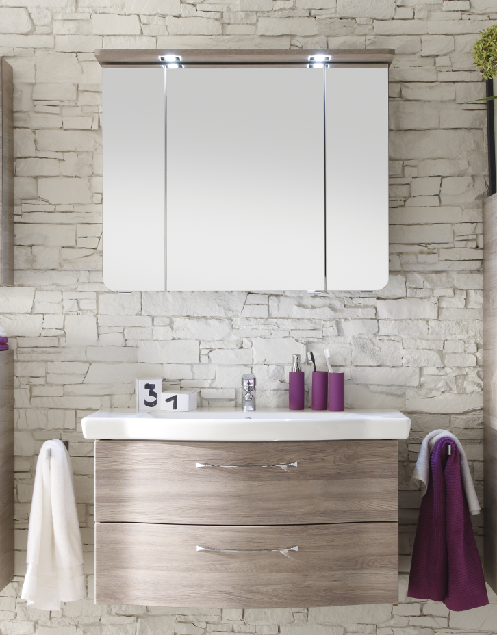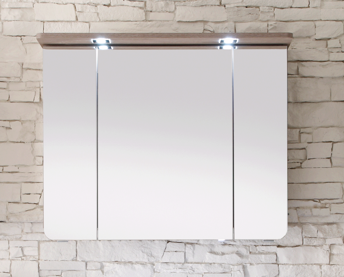 Das Badmöbelset wird mit einem modernen Spiegelschrank vervollständigt. Der Pelipal 6005 Badspiegel AG-SPS 03 ist mit drei Spiegeltüren, zwei LED-Einbaustrahlern, welche bereits im Kranzboden des Spiegelschrankes integriert ist, sechs Einlegböden aus Glas und einem Schalter-Steckdosen-Element ausgestattet.