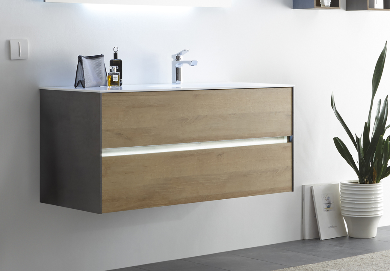 Die Besonderheit des Badmöbelprogrammes 6010 ist das grifflose Design der verschiedensten Schränke. Dies kann auch noch durch eine spezielle LED-Beleuchtung hervorgehoben werden. Gesteuert wird diese Grifffugen-Beleuchtung mit einem praktischen Bewegungssensor. Top-Modern und besonders praktisch!