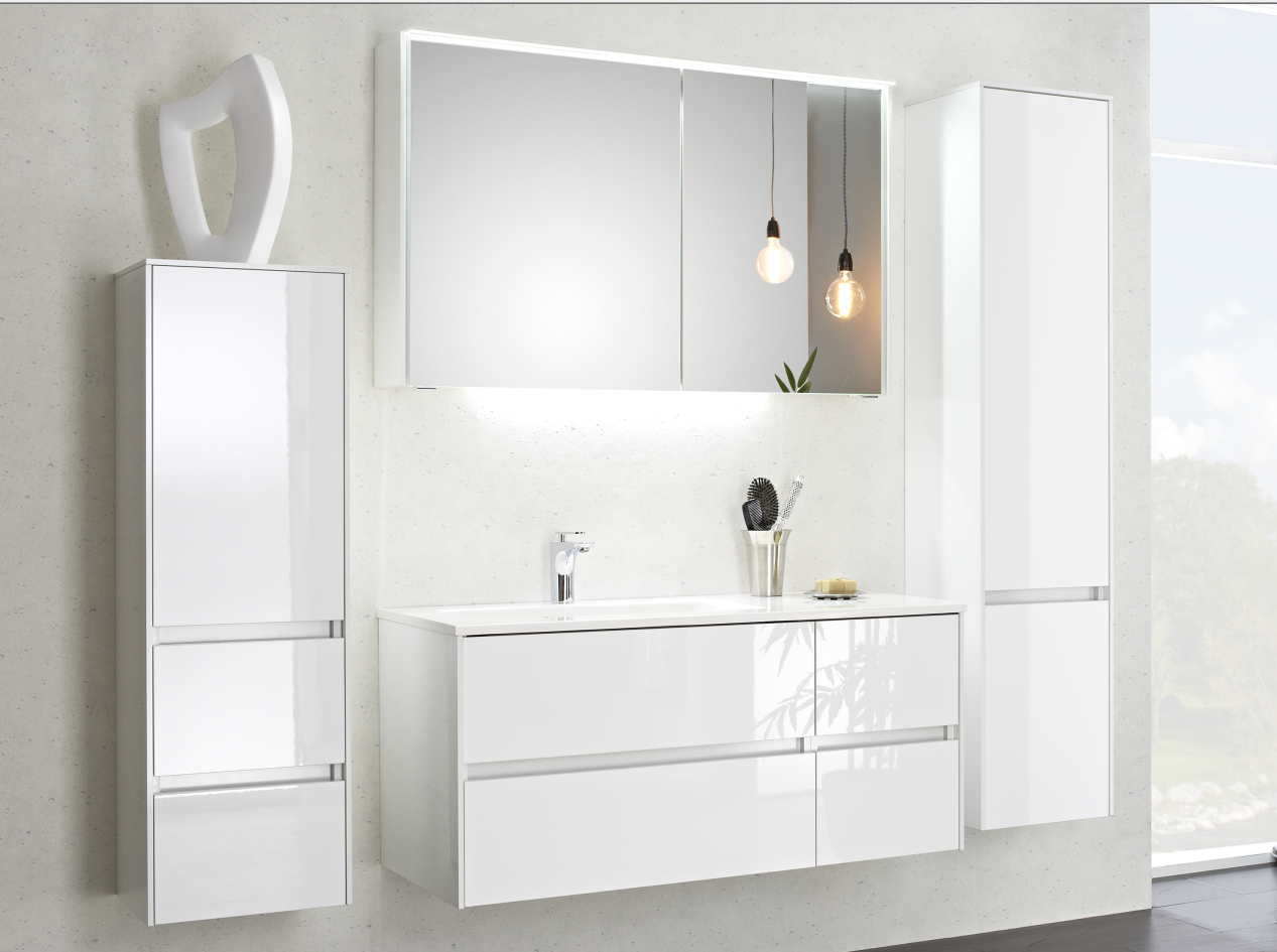 Die Besonderheit des Badmöbelprogrammes 6010 ist das grifflose Design der verschiedensten Schränke. Dies kann auch noch durch eine spezielle LED-Beleuchtung hervorgehoben werden. Gesteuert wird diese Grifffugen-Beleuchtung mit einem praktischen Bewegungssensor. Top-Modern und besonders praktisch!
