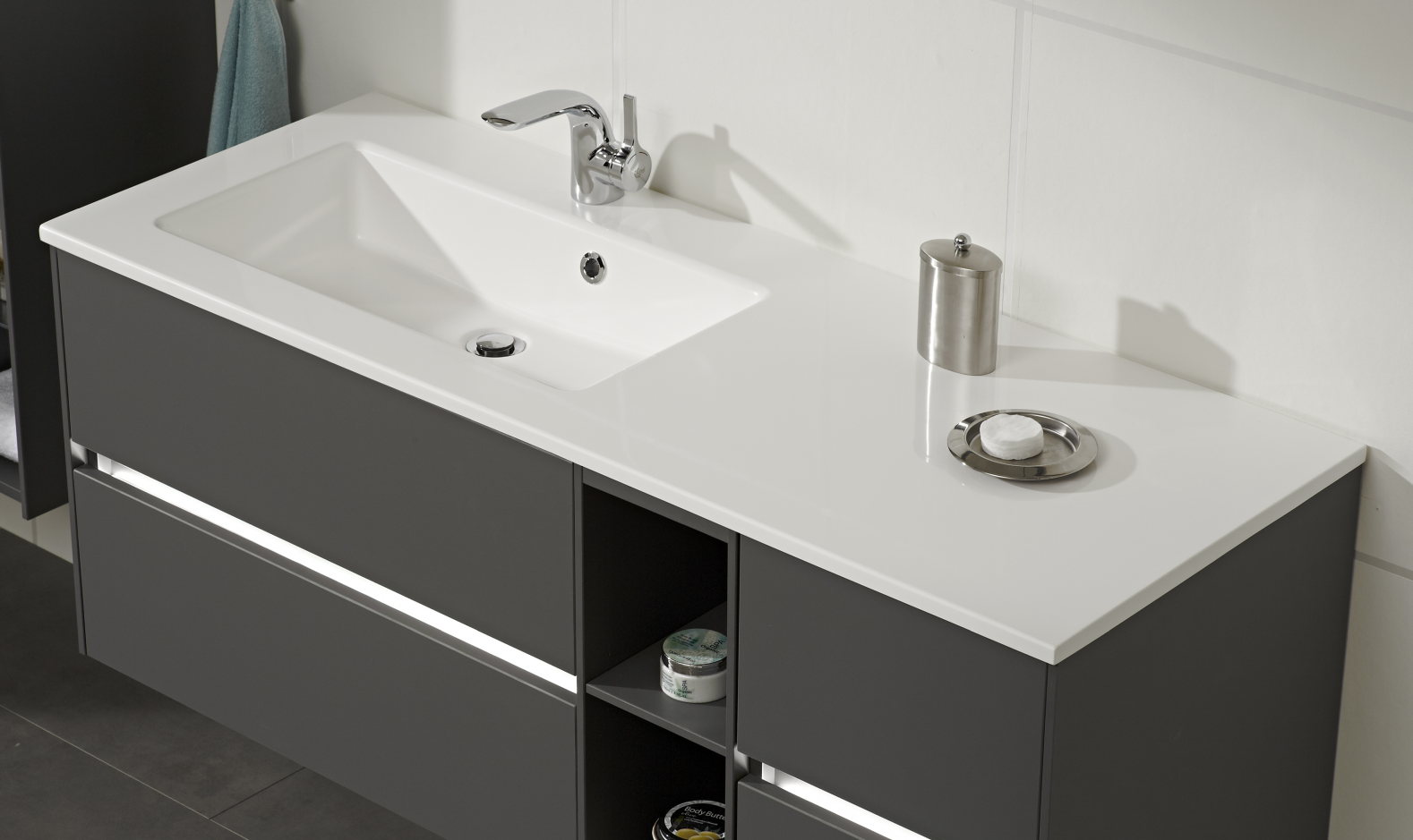 Die dazu passenden Pelipal 6010 Waschtischunterschränke sind ausgestattet mit vier Auszügen und einem Regal. Unterhalb des Beckens jeweils zwei großzügige Schubkästen mit einem Kosmetikeinsatz im oberen Bereich, danach ein offenes Regal mit einem Zwischenboden und weiter nochmals zwei kleinere Schubkästen. Der Wachtischunterschrank hat eine Breite von 132 cm, eine Höhe von 51,2 cm und eine Tiefe von 49,3 cm. Auswählbar hierzu ist eine wunderschönen LED-Grifffugenbeleuchtung. Sie zaubern damit einen großartigen Effekt in Ihrem Badezimmer.