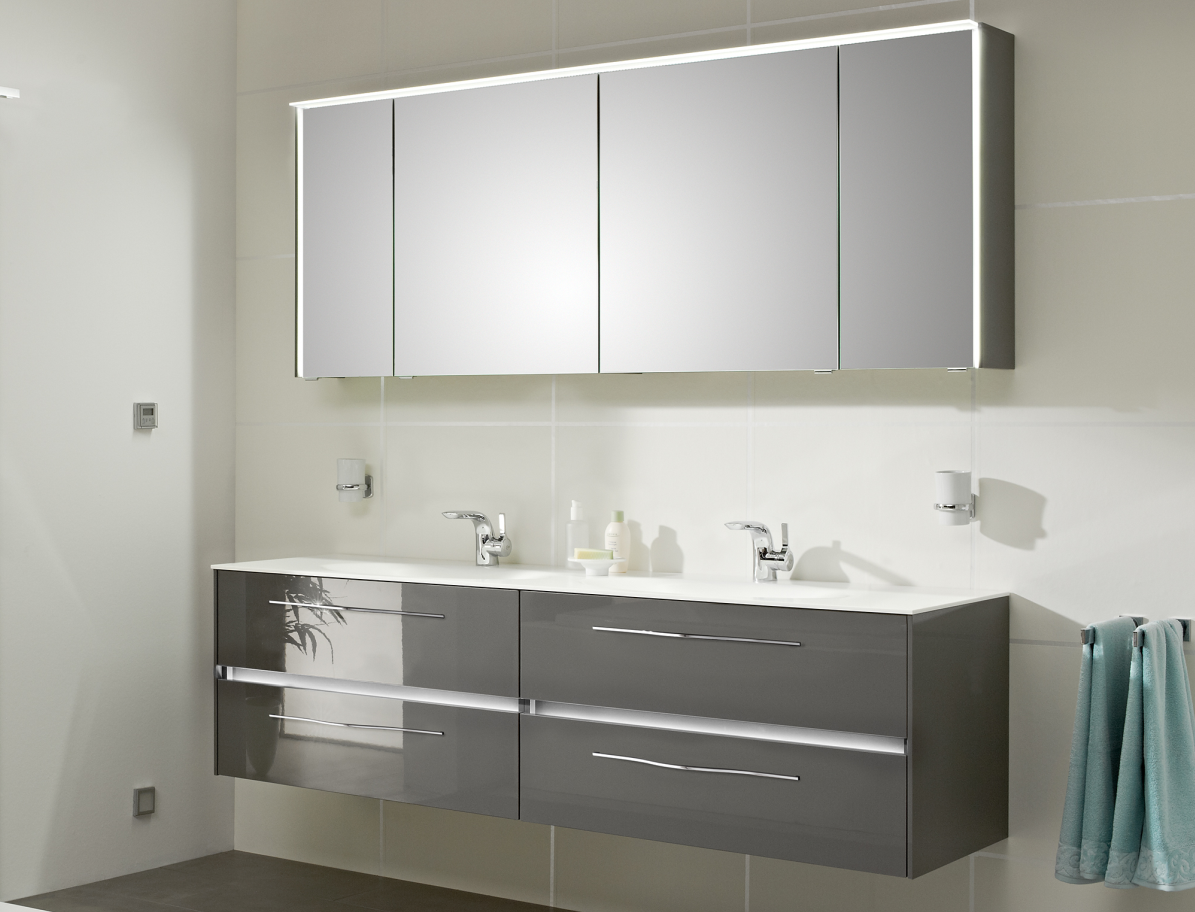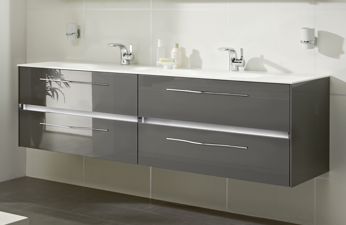 Die Besonderheit des Badmöbelprogrammes 6010 ist das grifflose Design der verschiedensten Schränke. Dies kann auch noch durch eine spezielle LED-Beleuchtung hervorgehoben werden. Gesteuert wird diese Grifffugen-Beleuchtung mit einem praktischen Bewegungssensor. Top-Modern und besonders praktisch!