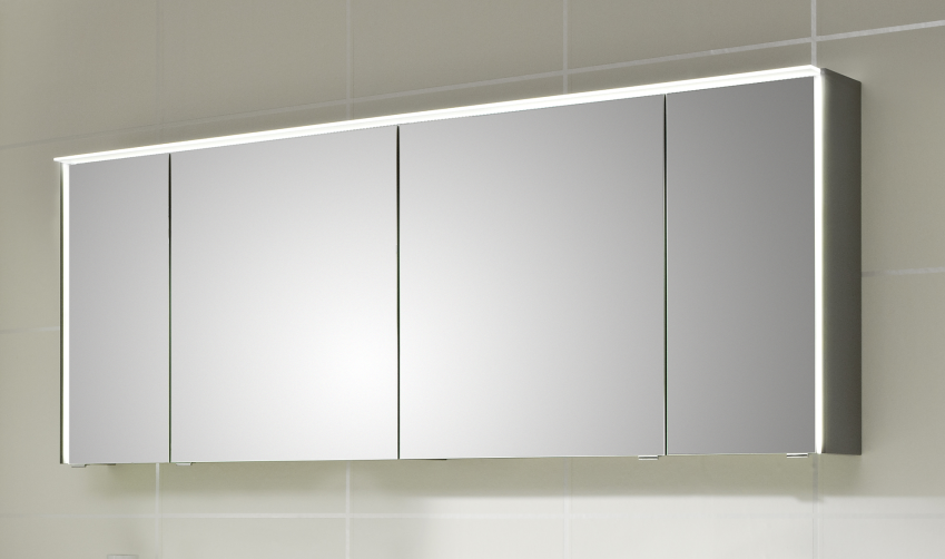 Ein dreitüriger Spiegelschrank mit einer außergewöhnlichen LED-Lichtkranzbeleuchtung oben oder ein dreitüriger Spiegelschrank mit einer ebenso außergewöhnlichen LED-Lichtkranzbeleuchtung oben und jeweils seitlich. Alle Spiegelschränke sind mit Einlegeböden und einem Schalter-Steckdosen-Modul versehen!