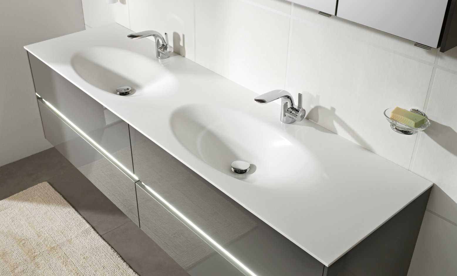 Das Waschbecken der Badmöbelserie 6010 ist je nach Materialart unterschiedlich geformt. Der Waschtisch aus Mineralmarmor ist eckig, während der Waschtisch aus dem Material Krion eher rund gehalten ist. Mineralmarmor hat eine geringe Wärmeleitfähigkeit und somit eine hohe Wärmekapazität. Das Material kann mit großer Gestaltungsfreiheit in individuelle Formen gegossen werden, daher ein sehr beliebtes Material für alle Badmöbelhersteller. Es zeichnet sich durch sein relativ leichtes Eigengewicht aus, sie sind einfach zu montieren, belastbar und bruchsicher.