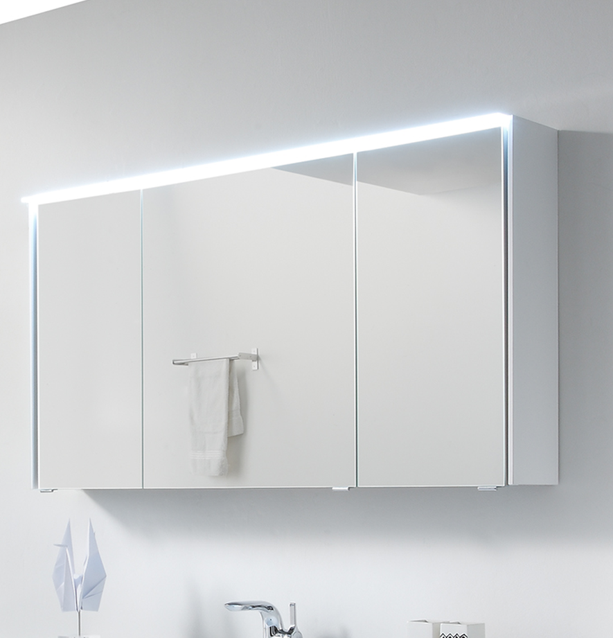 Sagenhafter Spiegelschrank aus dem Programm Pelipal 6010 mit einer tollen LED-Beleuchtung im oberen Bereich in einer Breite von 134 cm. In dem geradlinigen, dreitürigen Spiegelschrank ist eine 12,5 Watt LED-Beleuchtung als Kranzboden eingearbeitet. Durch das leicht nach vorn angebaute Design wird Ihr 6010 Spiegelschrank optimal ausgeleuchtet und zaubert gleichzeitig ein warmes Licht in Ihre Badezimmer.