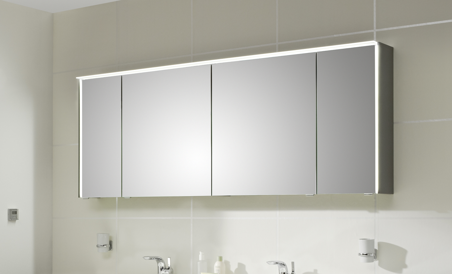 In dem geradlinigen, viertürigen Spiegelschrank ist eine 17,28 Watt LED-Beleuchtung im Kranzboden oben und ein exklusive 6,7 Watt LED-Lichtprofil seitlich eingearbeitet. Durch das leicht nach vorn angebaute Design wird Ihr 6010 Spiegelschrank optimal ausgeleuchtet und zaubert gleichzeitig ein warmes Licht in Ihre Badezimmer. Diese tolle LED-Beleuchtung wird durch ein Schalter-Steckdosen-Modul, welches sich im Inneren des Spiegelschrankes befindet gesteuert.