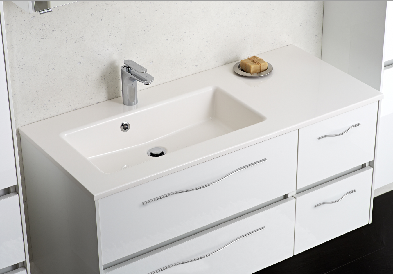 Das asymmetrisch geformte Pelipal 6010 Waschtischset hat eine Breite von 113 cm und besteht aus einem hochwertigen Waschtisch mit Becken links / Ablage rechts, wählbar in den Materialien Mineralmarmor oder Krion und dem passenden Waschtischunterschrank mit vier Auszügen. Die Beckenformen unterscheiden sich je nach Materialauswahl. Das Pelipal 6010 Becken aus Mineralmarmor ist eckig geformt, während das Becken aus dem Material Krion eher rund gehalten ist.